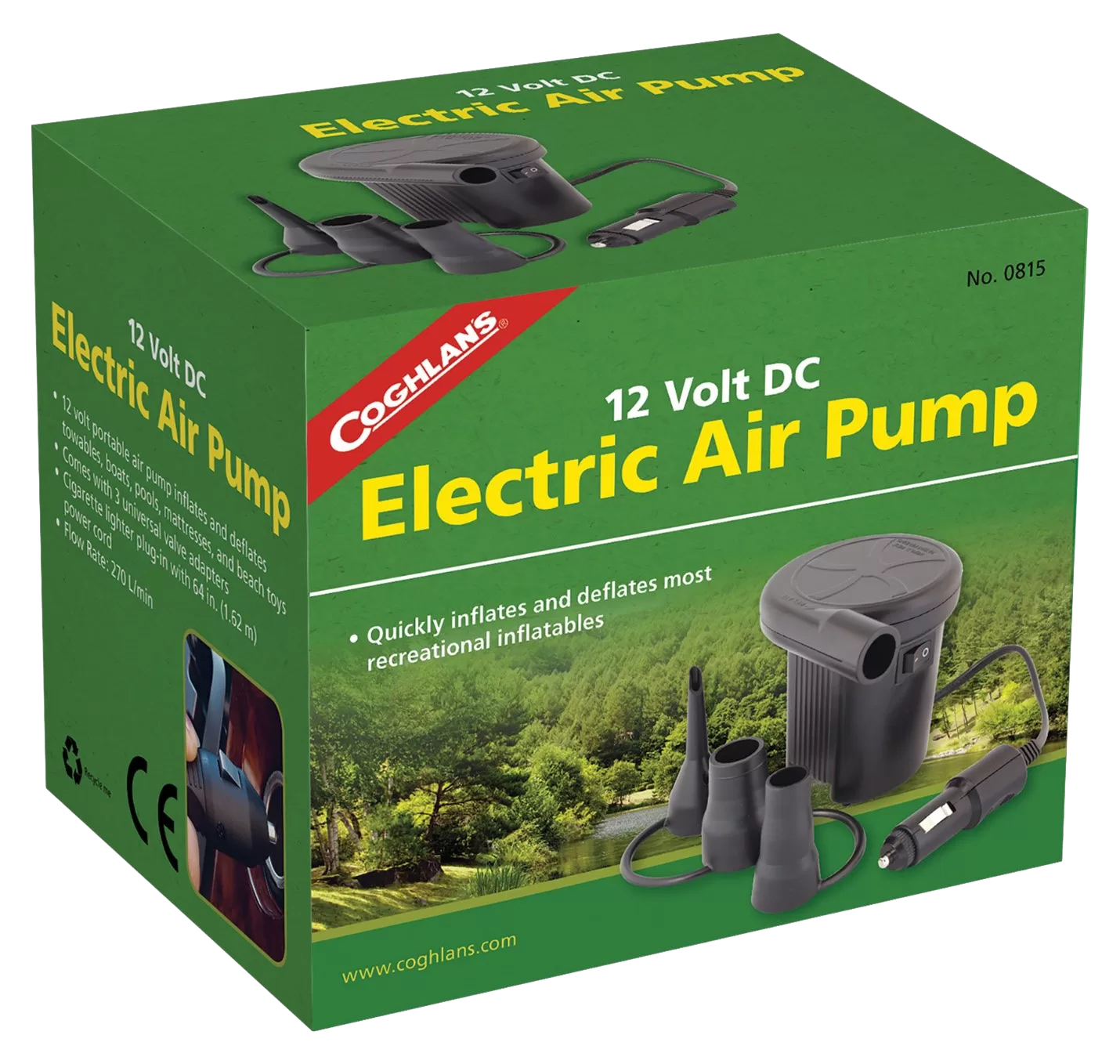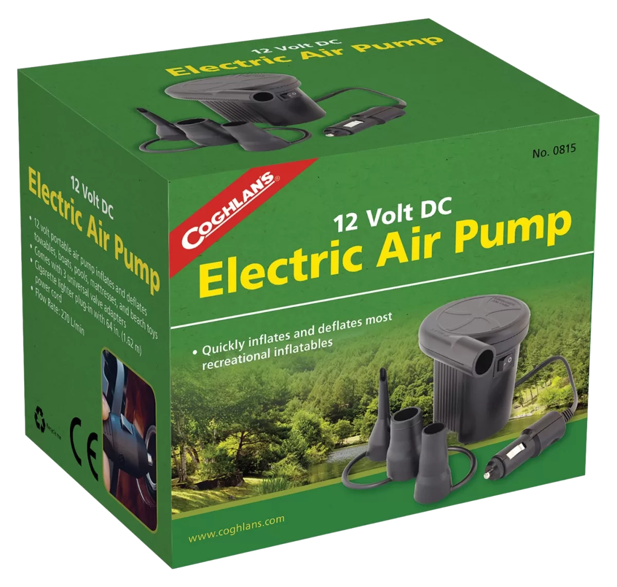 Plugs into any 12 VDC 5.5A outlet to fill small to medium size inflatables quickly. Comes with a 64 ft power cord with three valve adapters. Can be used for both inflation and deflation.