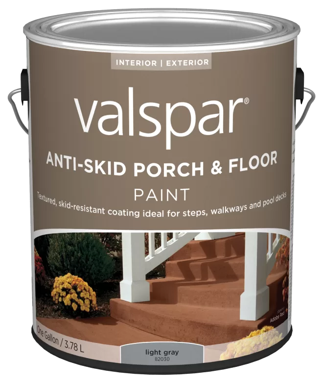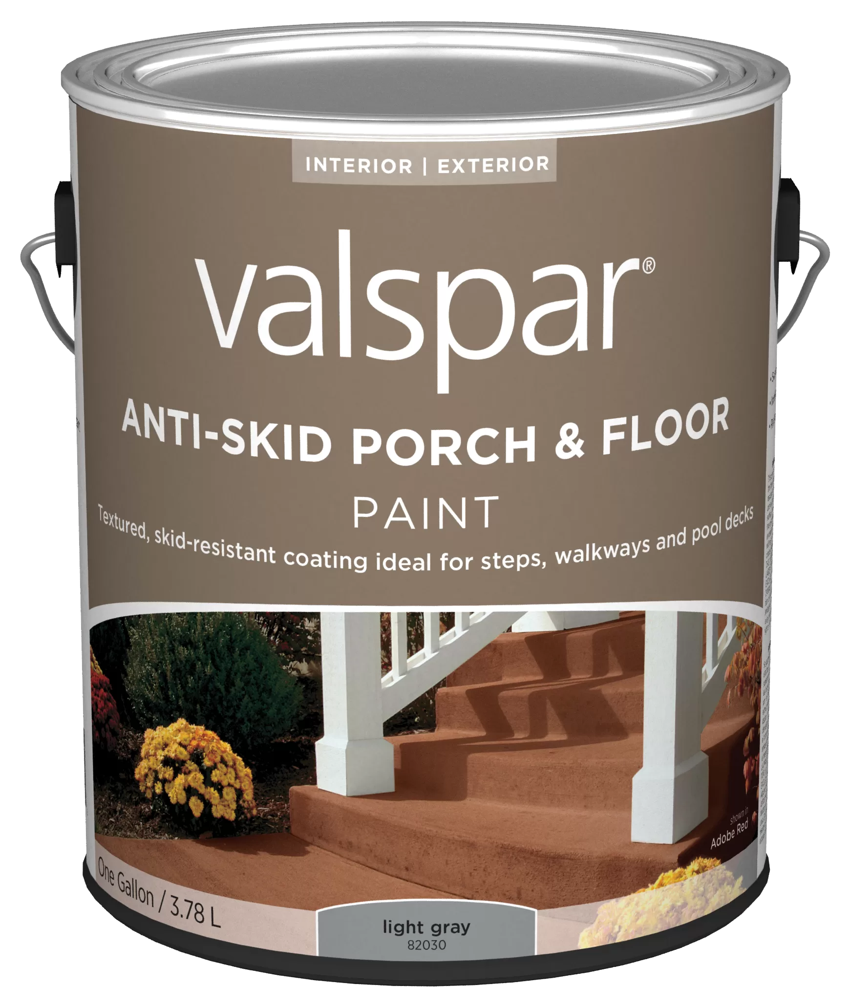 Valspar Anti-skid porch and floor paint is a 100% acrylic, texturized-surface coating for concrete, asphalt and other floor surfaces walkways, tennis courts, pool decks, steps, ramps, laundry areas.