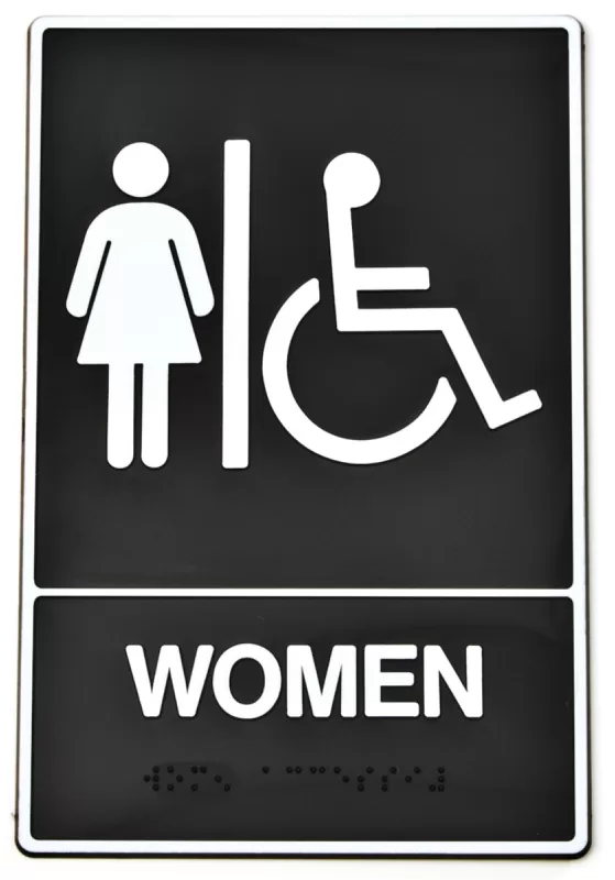 Braille 2 raised lettering and graphics meet ADA requirements. Made of heavy-duty plastic with contrasting eggshell finish and self-adhesive tabs. Packaged for the customer to feel the contour of the sign. Sign shows handicap symbol and states “WOMEN”.