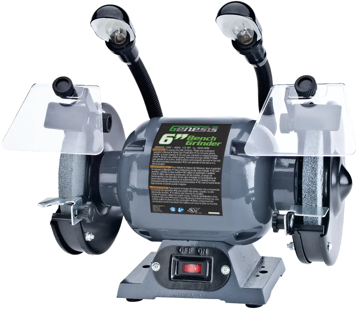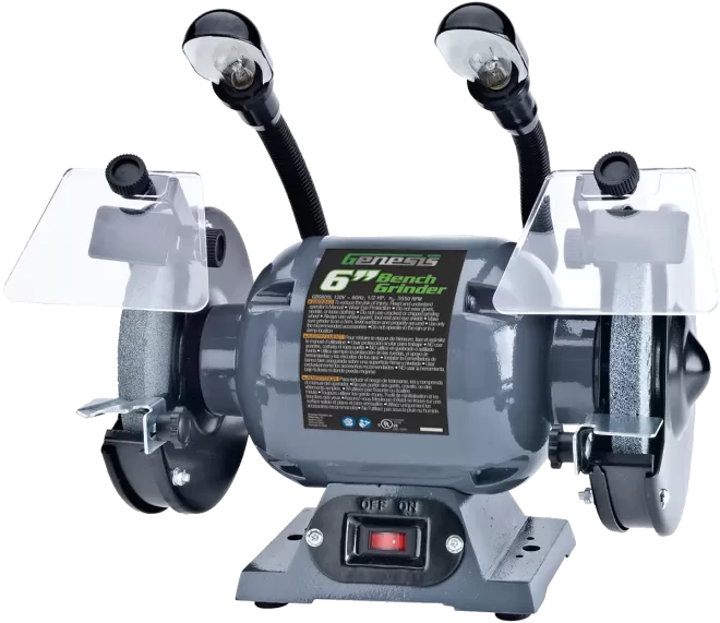 1/2 hp induction motor for quiet smooth performance. Two flexible gooseneck lights for better illumination. Adjustable tool rests. Eye shields for safety. No load speed of 3550 rpm.