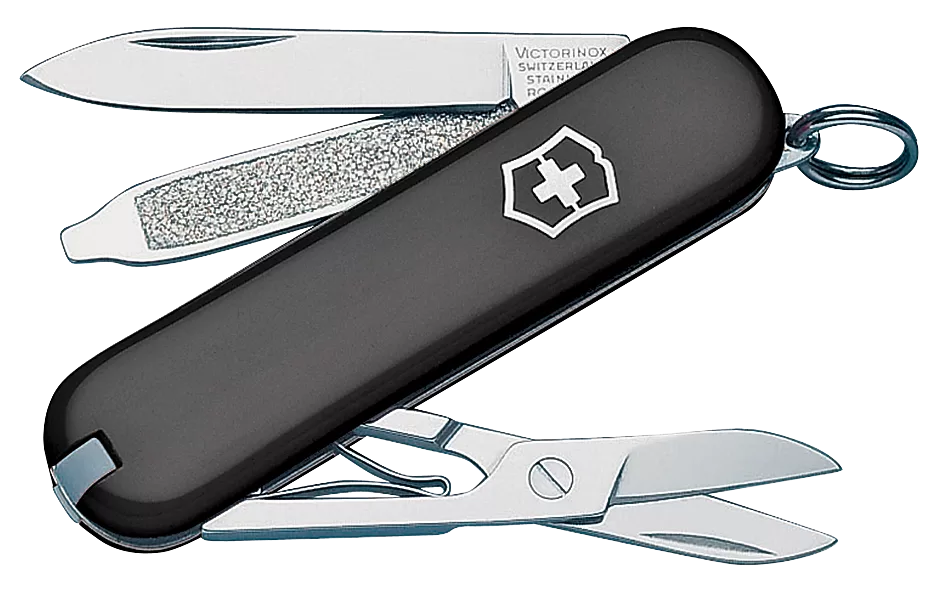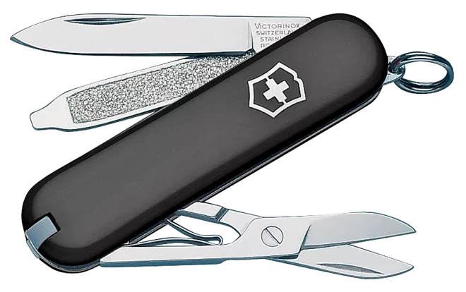 Features a small blade, scissors, nail file with screwdriver tip, toothpick, tweezers and key ring. 2-1/4 in closed.