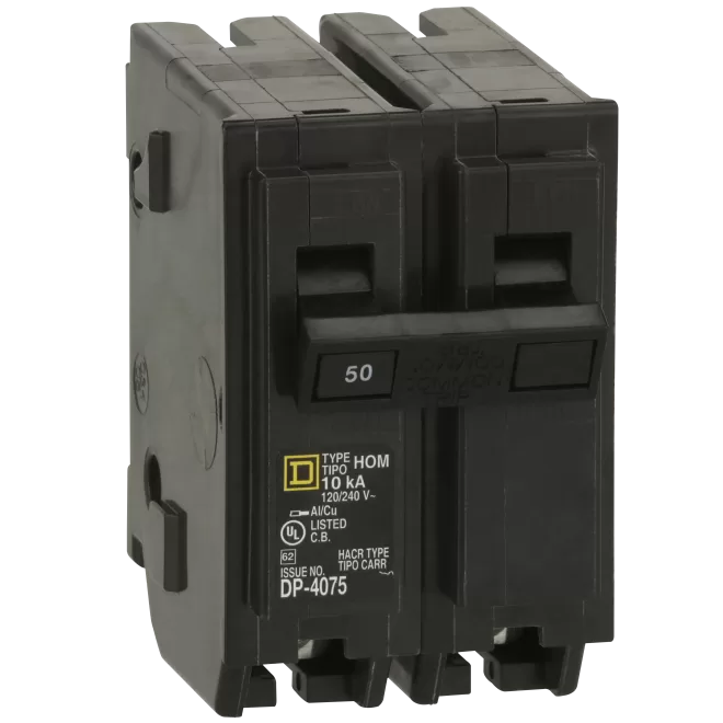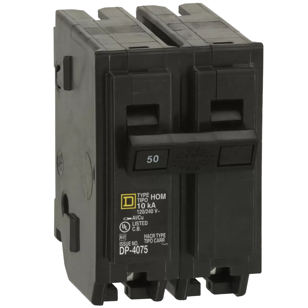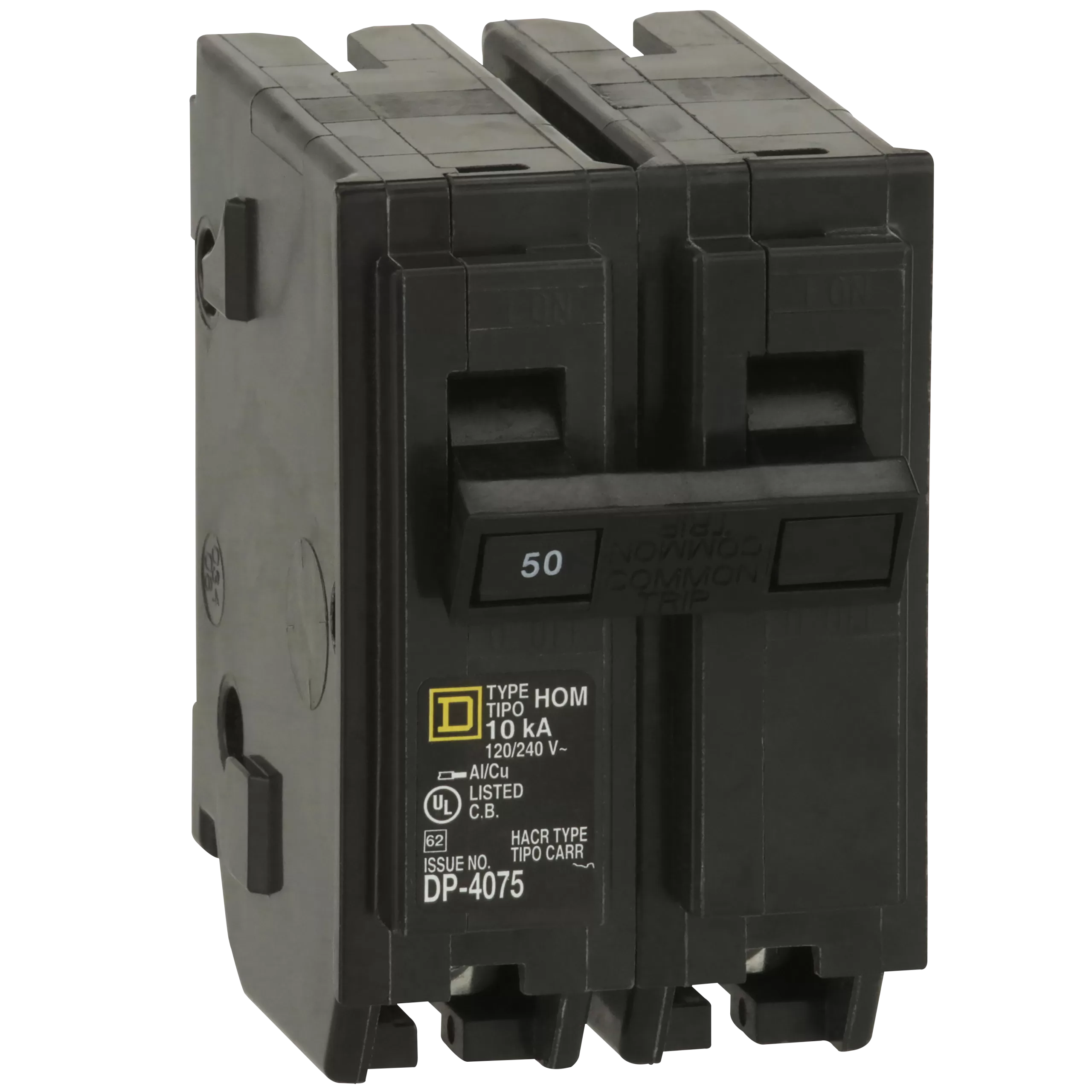 Square D Homeline HOM250CP Circuit Breaker, Mini, 50 A, 2 -Pole, 120/240 V, Fixed Trip, Plug Mounting, Black