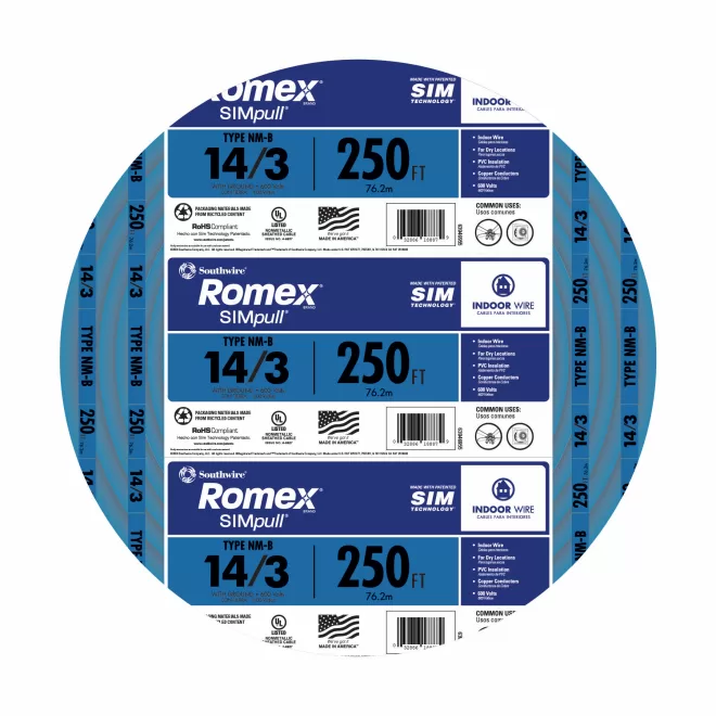 Romex 14/3NM-WGX250 Building Wire, 14 AWG Wire, 3-Conductor, 250 ft L, Copper Conductor, PVC Insulation, Nylon Sheath