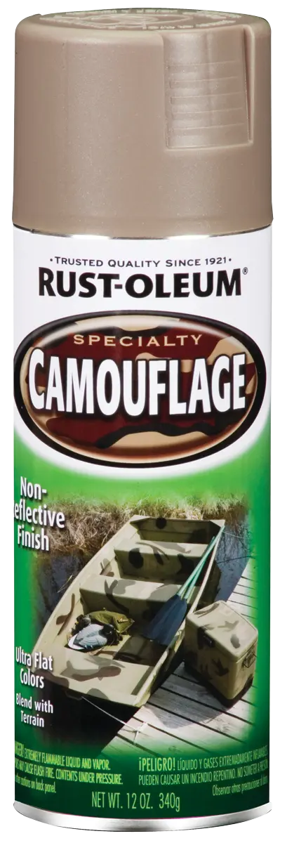 Camouflage Spray Paint, Ultra Flat, Khaki, 12 oz Specialty Camouflage Spray provides a non-reflective, ultra-flat finish for maximum hiding. Applies to metal, wood, plaster or masonry. Offers long-lasting protection when applied on top of primer.