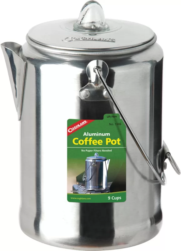 Great for camping, the Coghlan’s aluminum 9 CUP coffee Percolator is made of durable, rustproof, polished aluminum. Features a percolator stem with basket and dual bail handles on top and the side for a steady pour. This percolator heats fast.