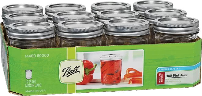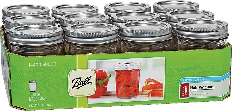 Ball Mason Jar, Regular Mouth, 8 oz, Glass, Clear, Includes: (12) Mason Jars with lids and rings. Jars are freezer safe.