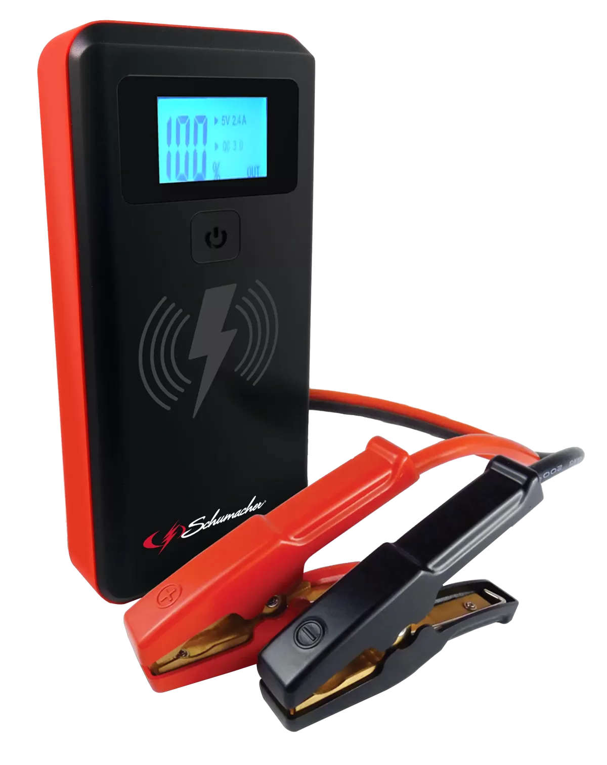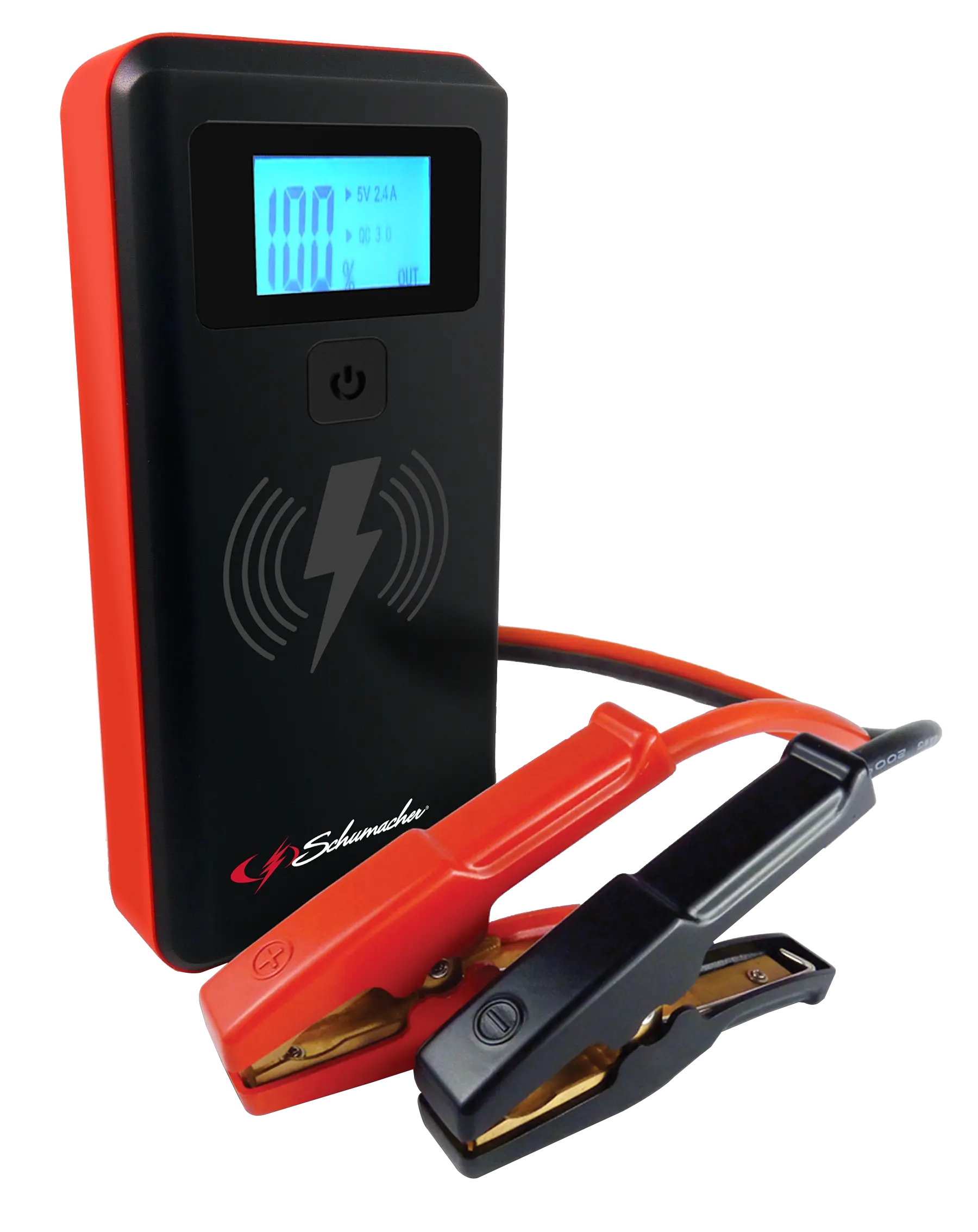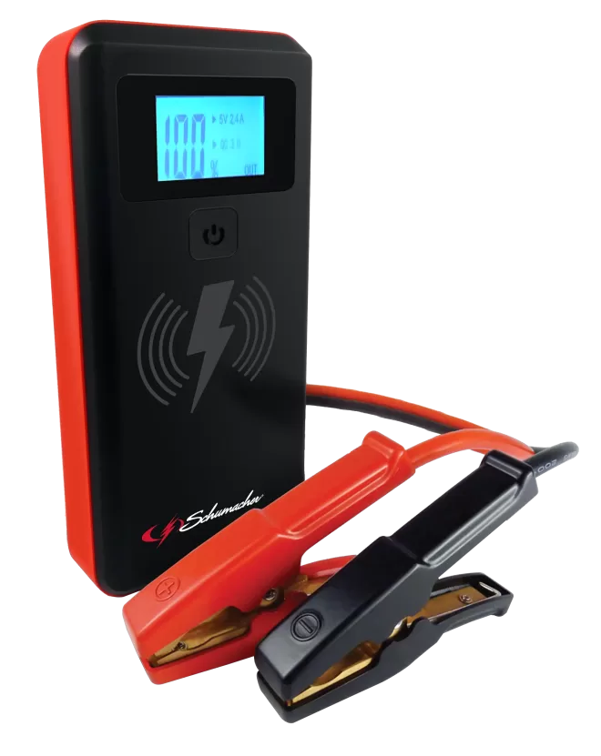 Schumacher Jump Starter/Power Pack, 12 VDC, 2000 A, Lithium-Ion Battery, Outputs USB: 2, LED Indicators: Yes, Dimensions: 4.13 x 10.88 x 10.5 in, Includes: (1) Smart Cable with Clamps, (1) USB to Micro USB Charging Cable, (1) Travel Bag, (1) Manual