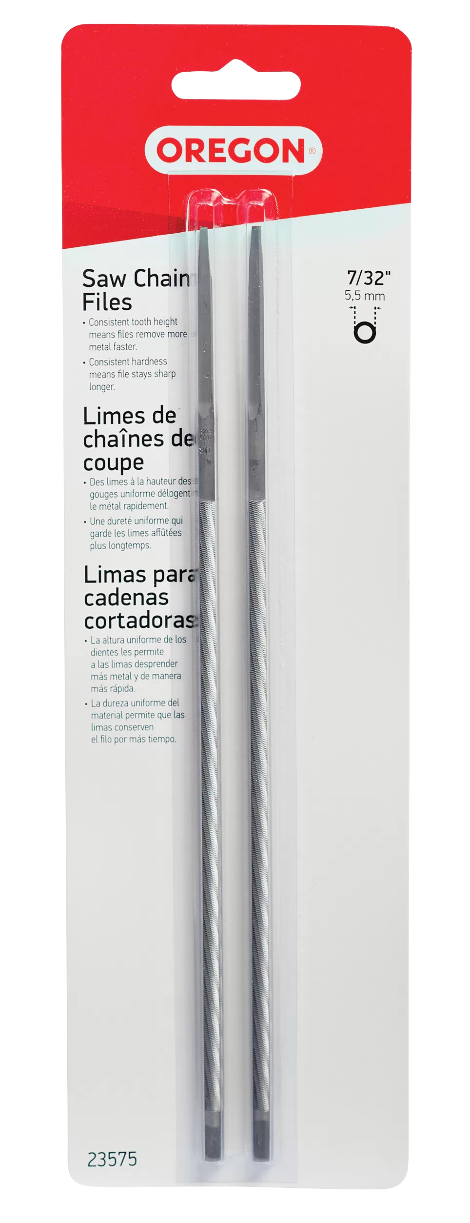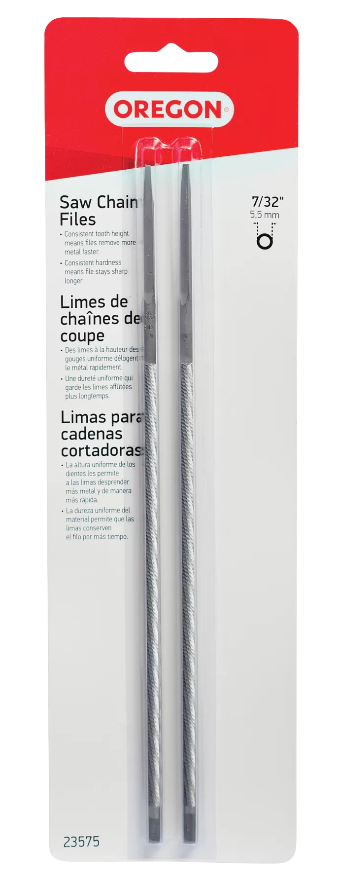 Oregon 23575 Chainsaw File, Double Cut, 7/32 in Dia Dimensions, Round, Steel, 2/PK. Premium files made with the finest steel using state-of-the-art production and finishing processes for excellent hand sharpening results on your saw chain.