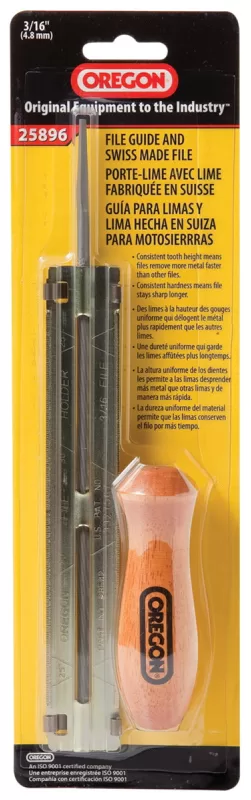 Oregon 25896 Chainsaw File Guide, 3/16 in Dia Dimensions, Round, Steel. Assembled 3/16 in file guide including one round file and one wooden handle.