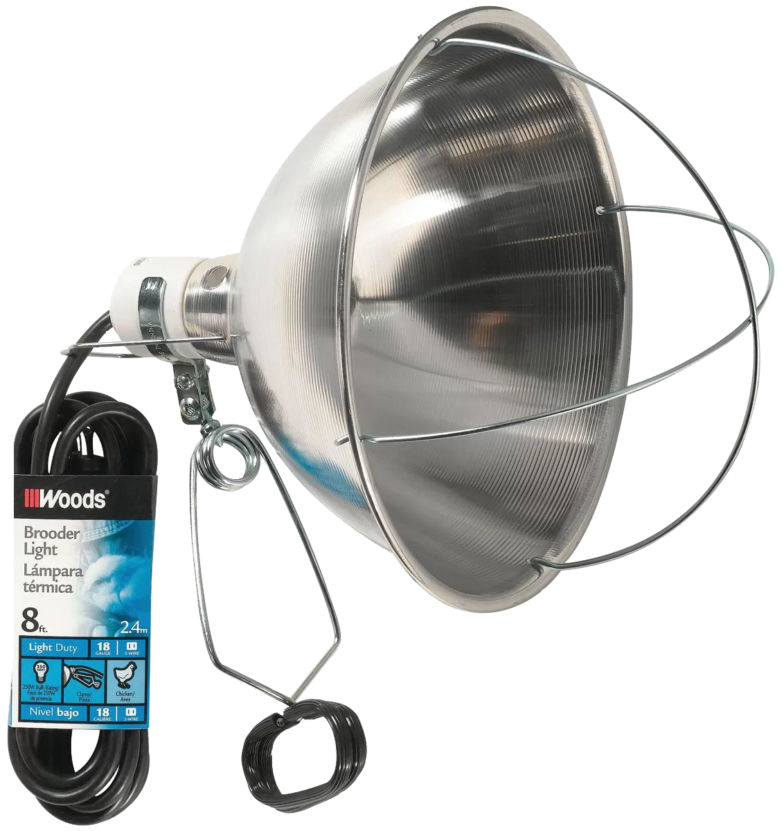 Features insulated porcelain sockets, heavy-gauge aluminum reflectors and hang-up hooks. Bulb guards snap on the reflector, two-conductor and polarized male plugs. Sturdy clamp with vinyl coated grips hold lamp in place.