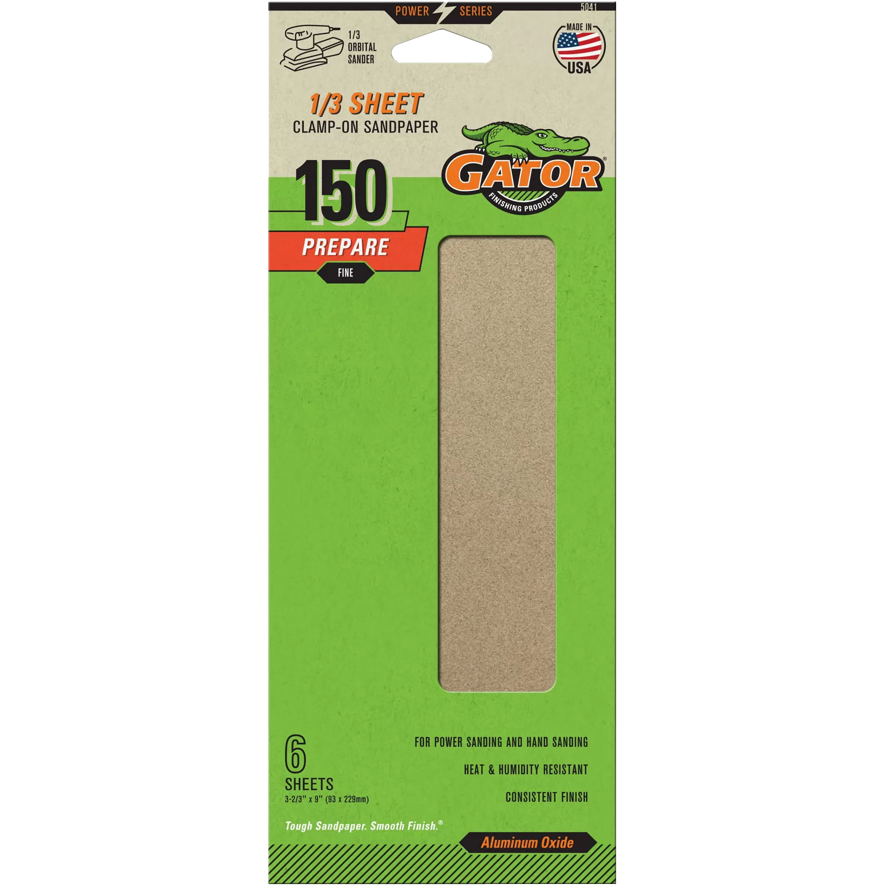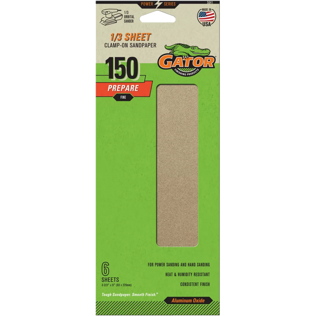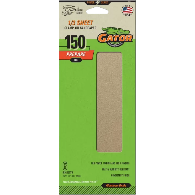 Length: 9″, Width: 3-2/3″, Grit: Fine (150), Backing Material: Paper, Abrasive Material: Aluminum Oxide, Suitable For: 1/3″ Sheet Palm Sander or Finishing Sanders and Camp-on 1/2″ Sheet Orbital Sanders, Applicable Material: Fiberglass, Metal, and Wood