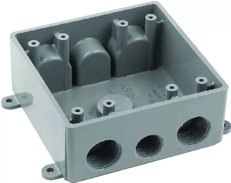 Cable Entry: Hub, Hub Size: 1/2″, Number of Gangs: 2, Number of Outlets: 7, Shape: Rectangular, Dimensions: 4.62″ L X 4.62″ W X 2″ H, Material: Gray PVC