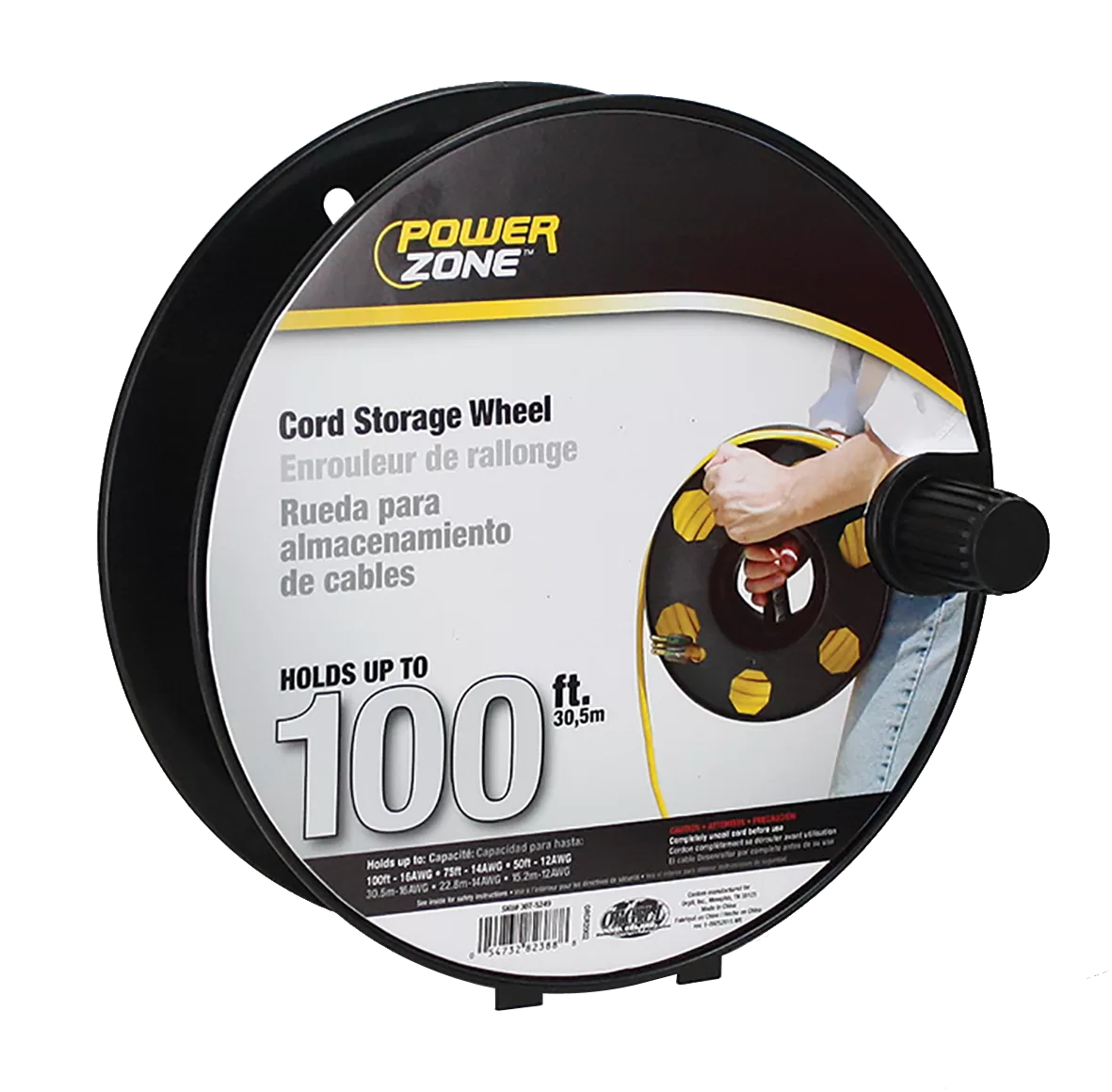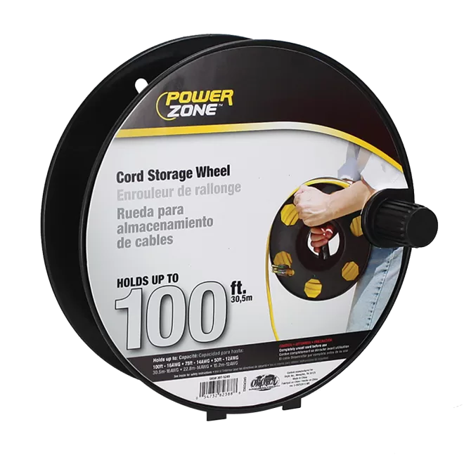 Cord Storage Reel, 100 ft L Cord, 16 AWG Wire, Black. ortable cord reels provide tangle-free portable storage for extension cords, hose, rope & holiday lights. The built-in stand helps make winding and storing easier.