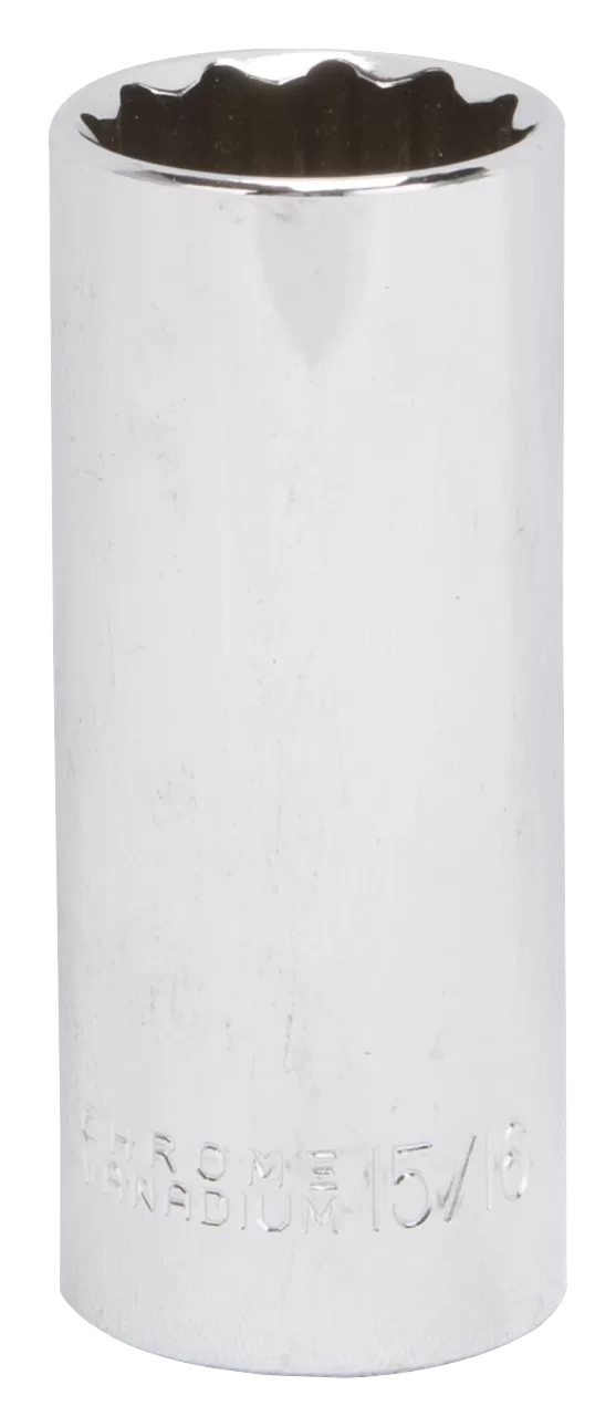 Socket Size: 15/16″, Drive Size: 1/2″, Outside Drive End Diameter: 1-1/4″, Nut End Outside Diameter: 1-1/4″, Number of Points: 12, Length: 3″, Material: Chrome Vanadium Steel