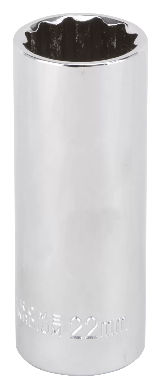 Socket Size: 22mm, Drive Size: 1/2″, Outside Drive End Diameter: 1-3/16″, Nut End Outside Diameter: 1-3/16″, Number of Points: 12, Length: 3-1/16″, Material: Chrome Vanadium Steel