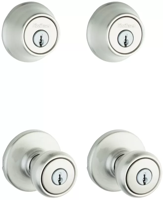 Includes two Tylo entry knob locksets and two #660 deadbolts. Knobs locked or unlocked by key outside or turn button inside. Deadbolt operated by key outside and thumb turn inside.