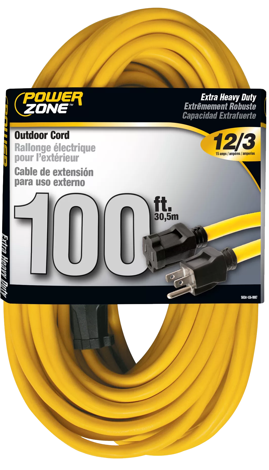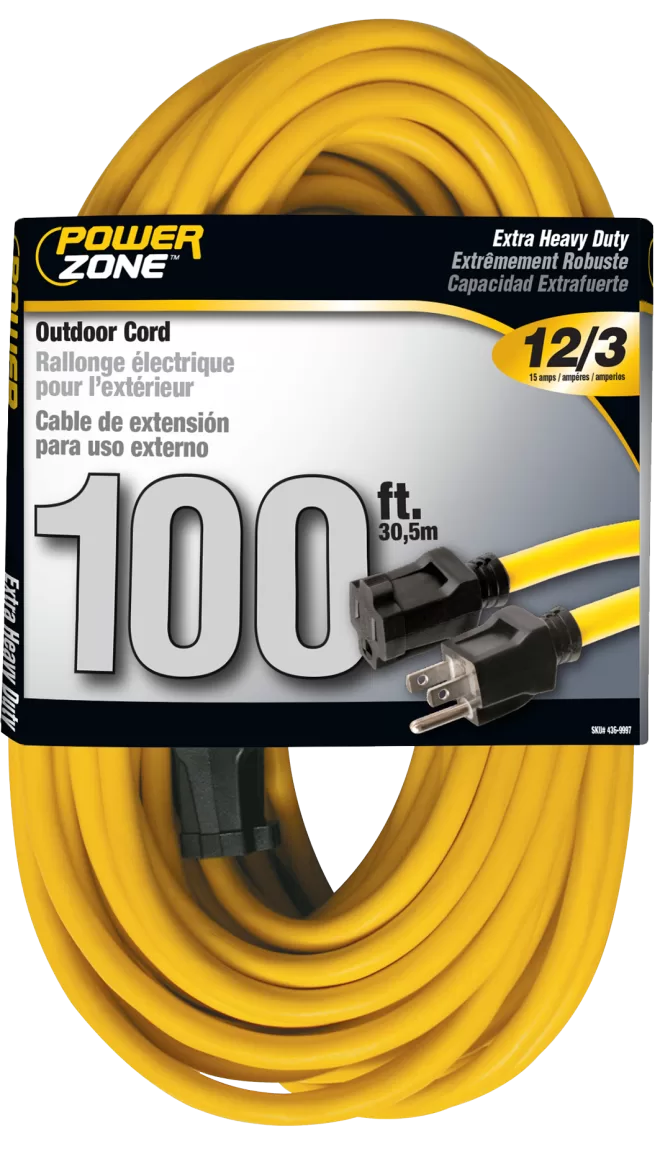 PowerZone Outdoor Extension Cord is water, weather, and abrasion resistant and flame retardant. This bright yellow extension cord is made for work on job sites and handles up to a 15 amp load.