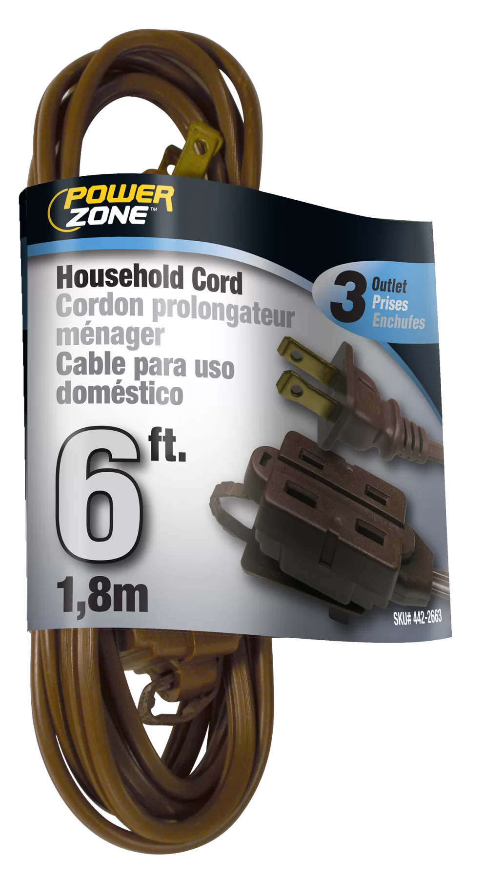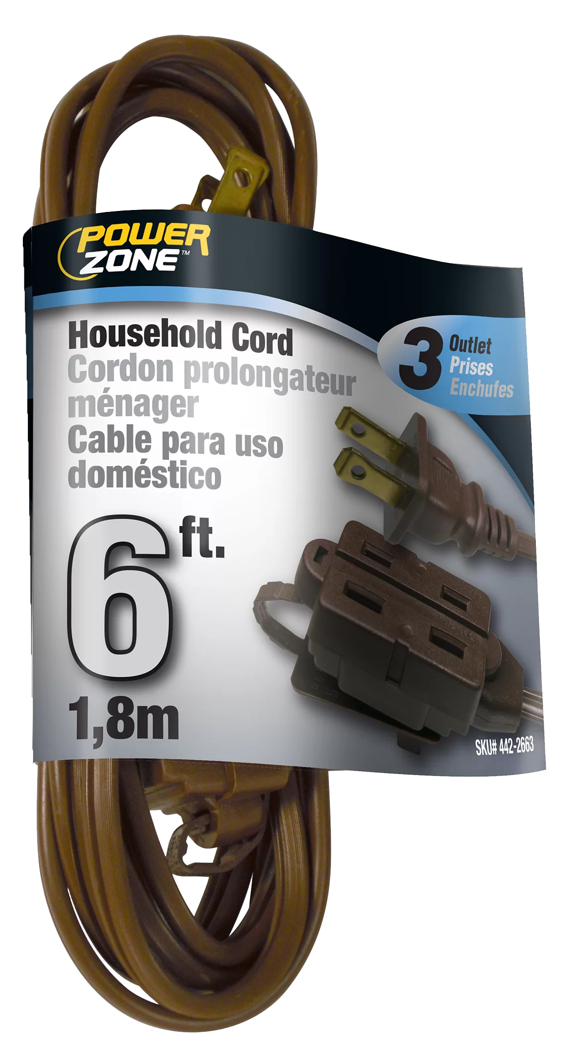 3-outlet Indoor Cords allow the use of up to three items in one small place. 6 AWG Cable, 6 ft L, 125 V, Brown
