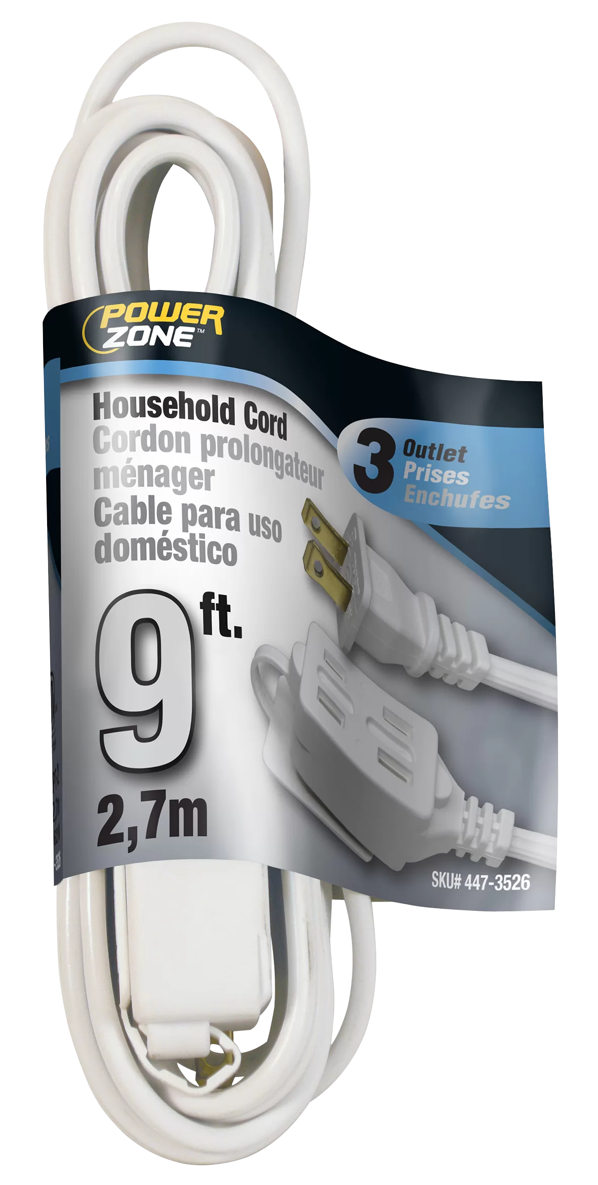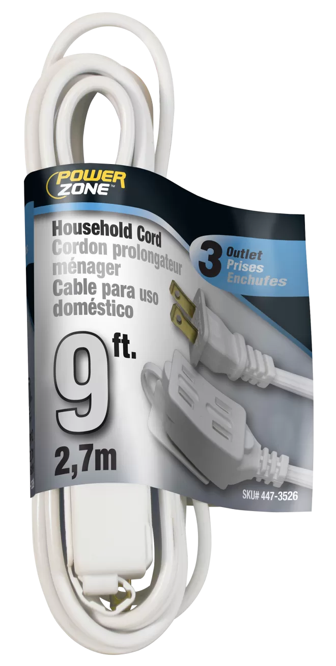 3-outlet Indoor Cord allows the use of up to three items in one small place. 16 AWG Cable, 9 ft L, 125 V, White