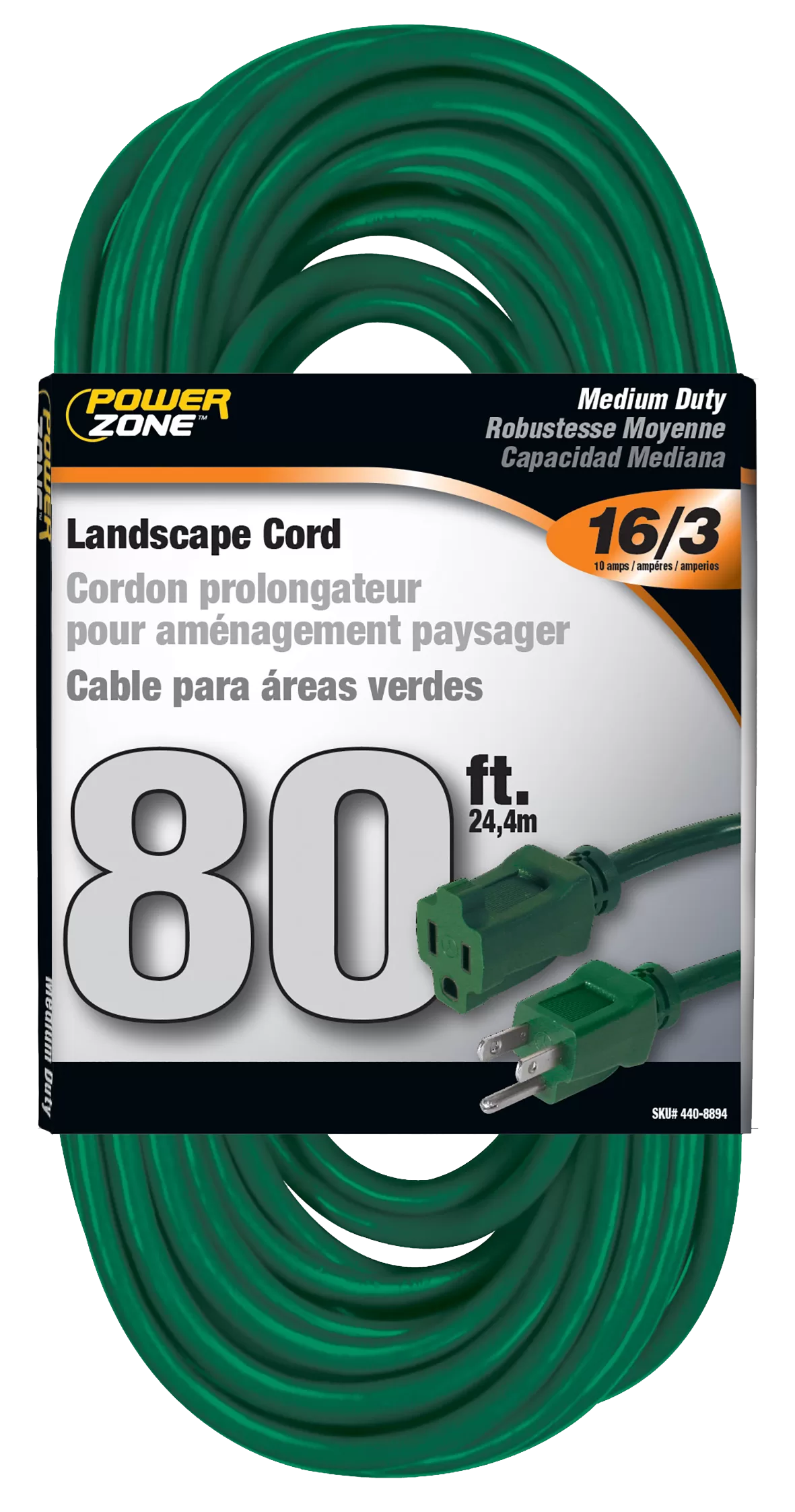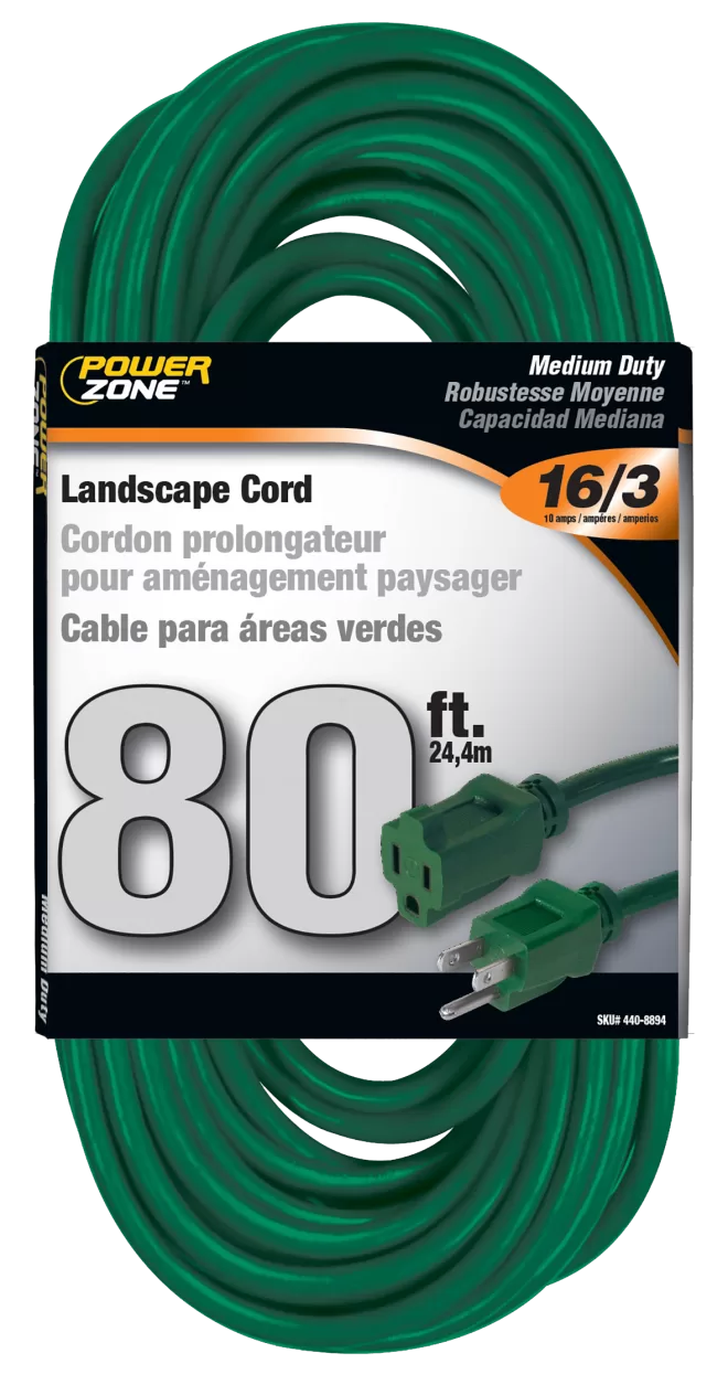 Extension Cord, 16 AWG Cable, 80 ft L, 125 V, Green. PowerZone Landscape Extension Cord is designed to blend into an outdoor environment. They work great with holiday & landscape lighting, bug zappers as well as other electrical yard decorations.