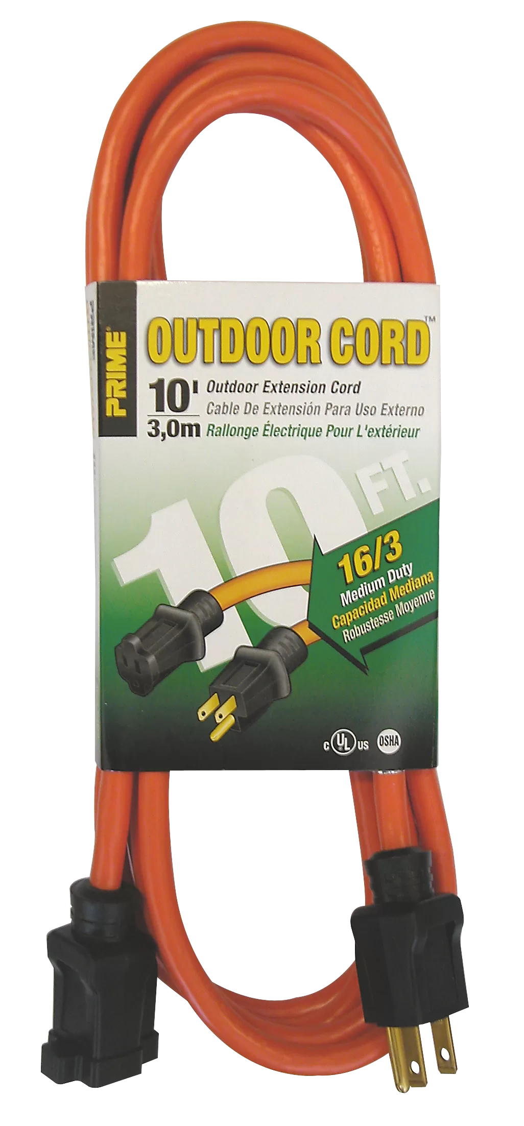 Outdoor Extension Cord, 16/3 AWG Cable, Orange Jacket, Brass Contact, Nickel Contact Coating, 10 ft Length
