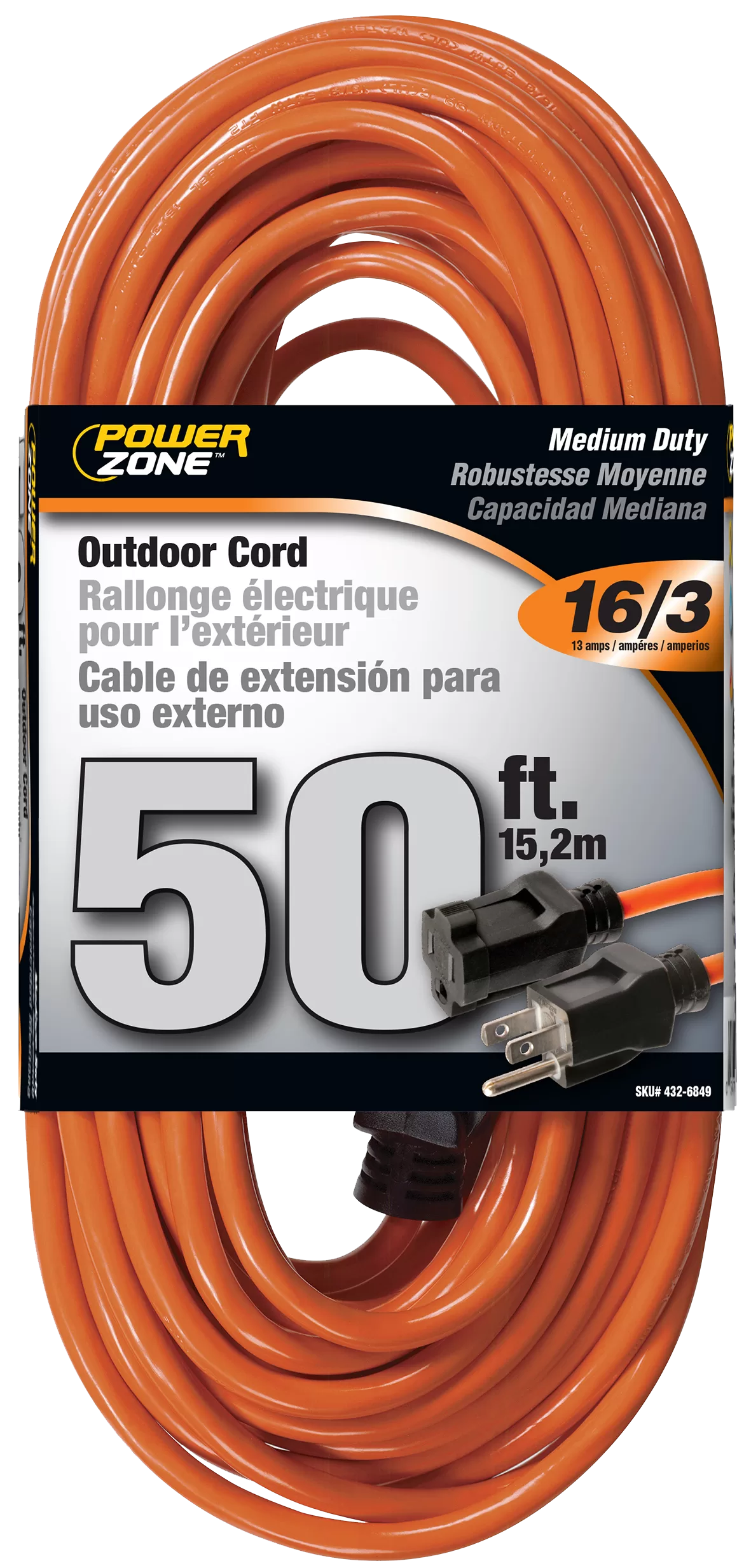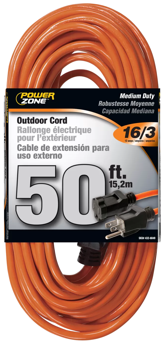 Extension Cord, 16 AWG Cable, 5-15P Grounded Plug, 5-15R Grounded Receptacle, 50 ft L, 125V. Outdoor Extension Cord is water, weather, and abrasion resistant and flame retardant. You can use the extension cord to plug in power tools, holiday light display