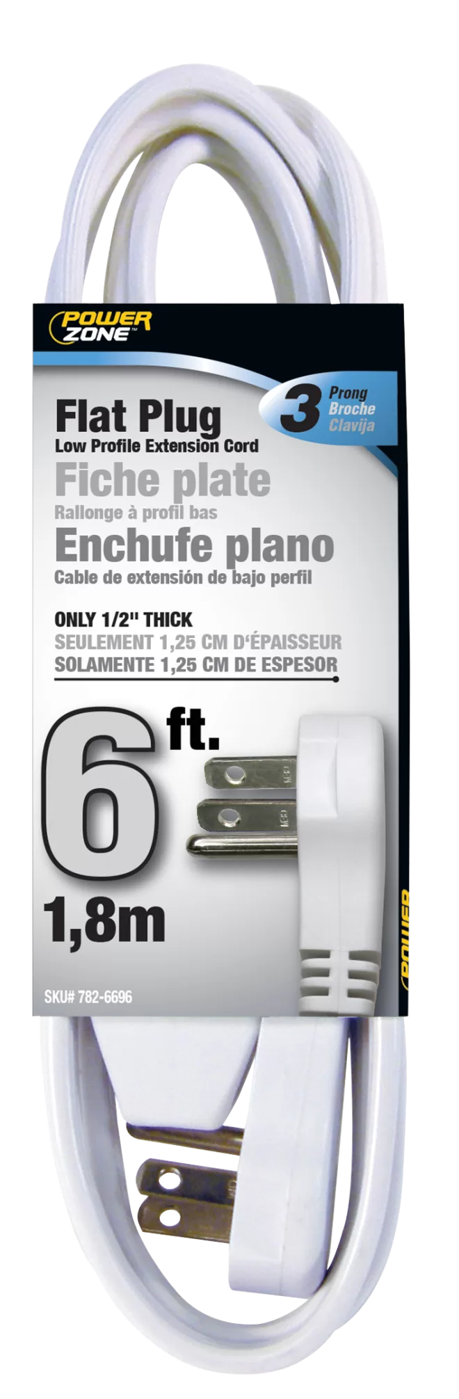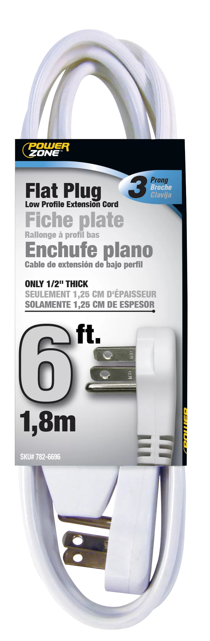 PowerZone Flat Plug Low Profile Extension Cord allows placement of furniture against the wall without dislodging or damaging the plug. 3-Outlet Indoor Cords allow the use of up to three items from one outlet.