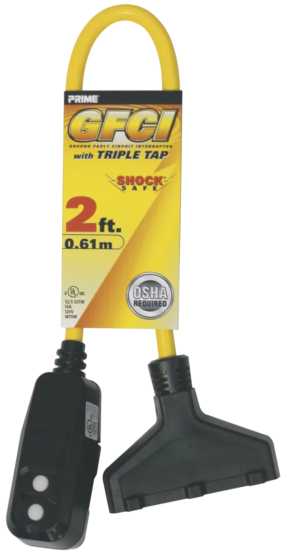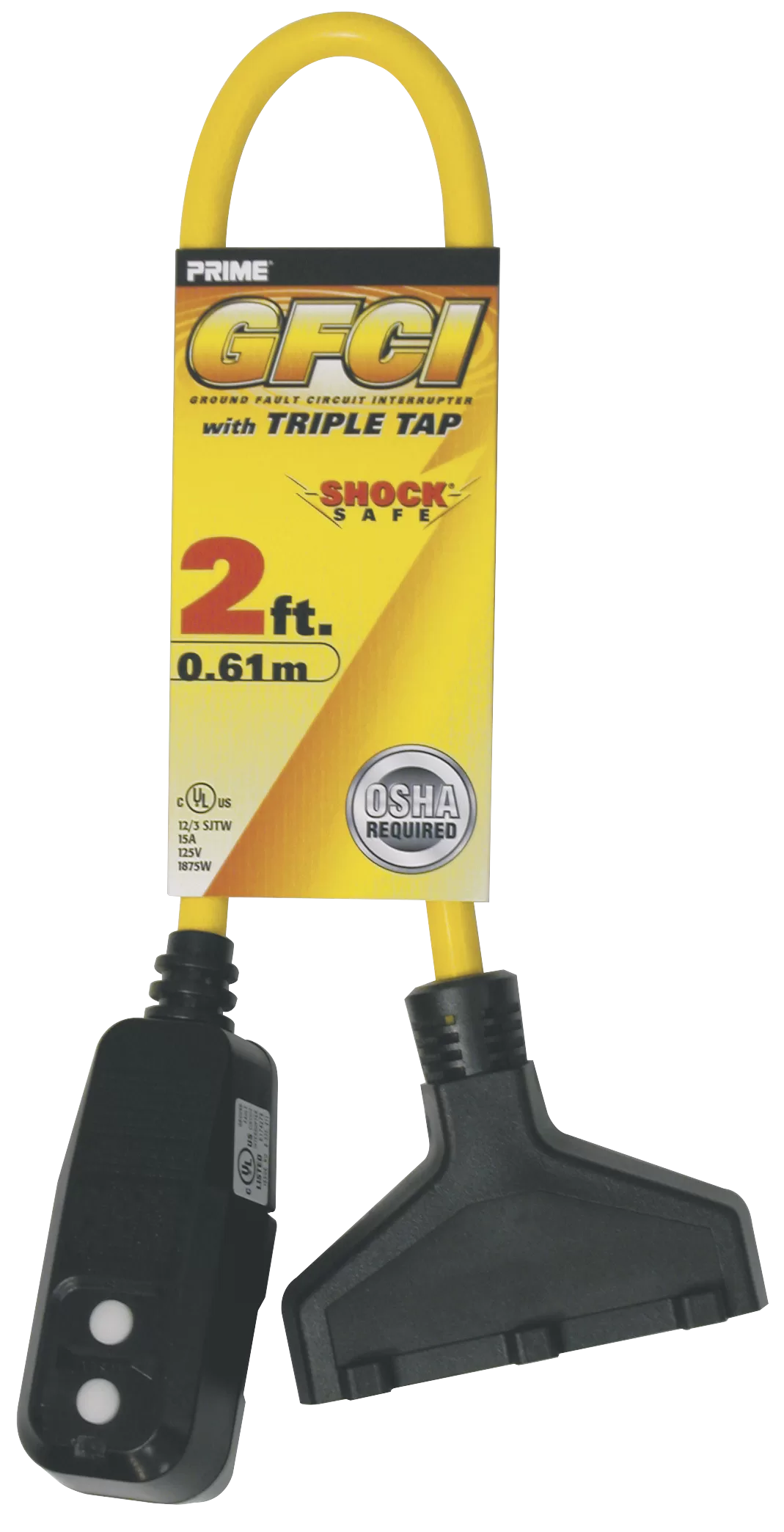 Triple Tap Adapter, 2 ft Cable, Female, Male, 15 A, 125 V, Yellow. Molded-on and bonded vinyl female connector and mechanical GFCI male plug. Three conductor SJTW 2 ft cord, triple tap.