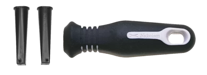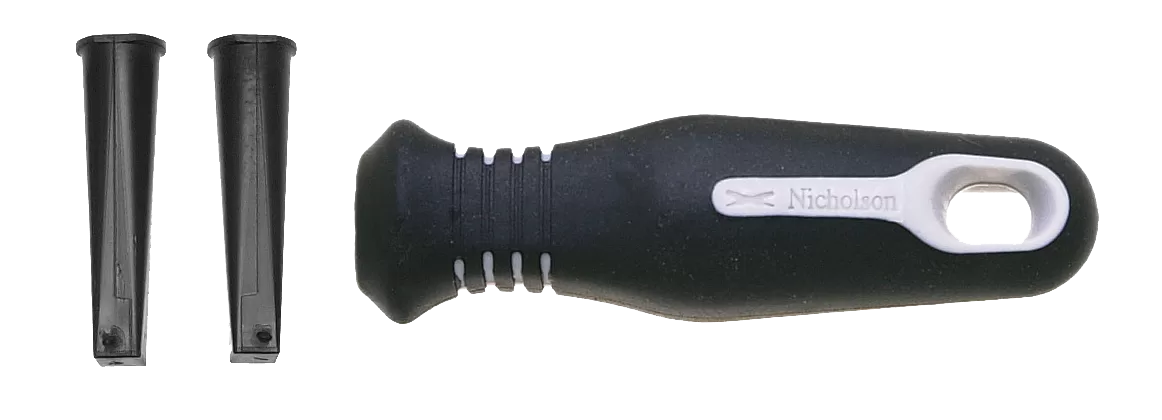 Interchangeable cushion inserts designed to fit most popular files. Handle made of strong high-impact material. Contoured to fit hand for straight, lathe and draw filing. Non-slip textured finish for easier grip. Includes four inserts.
