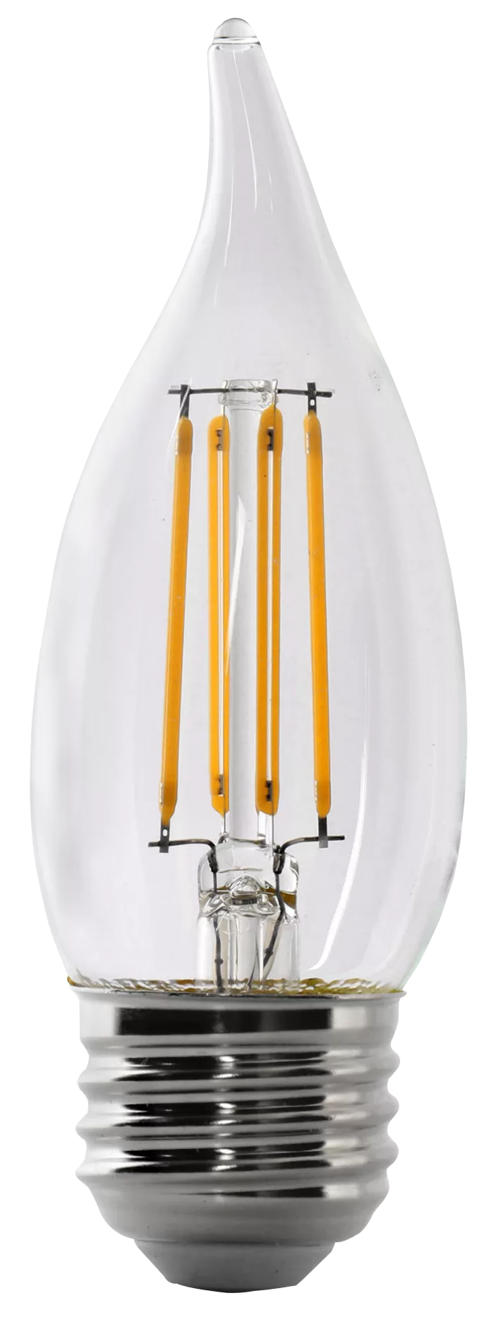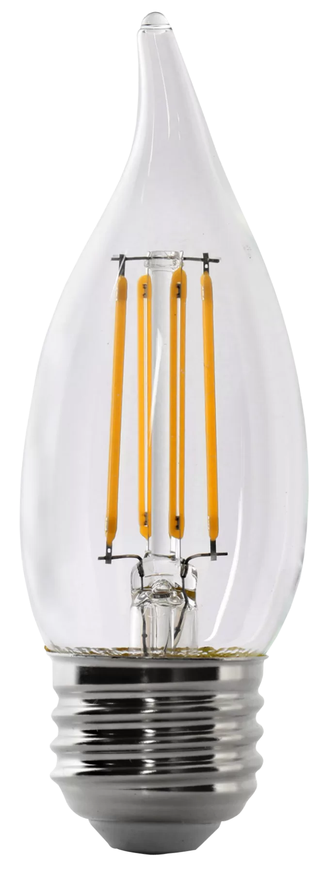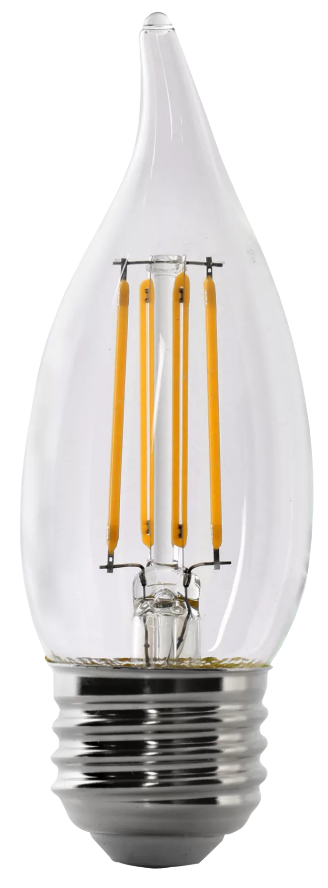 40W eq / 3.3W act, 120V, 300 Lumens, Color: 2700K (Soft White), Lamp Base: E26, Lamp shape: Flame Tip, Lamp Finish: Clear, Lamp Material: Plastic, Average Life: 15000 hr