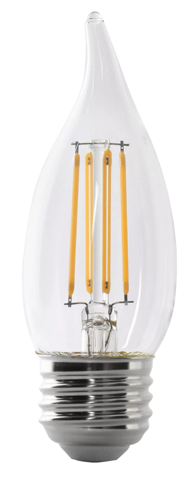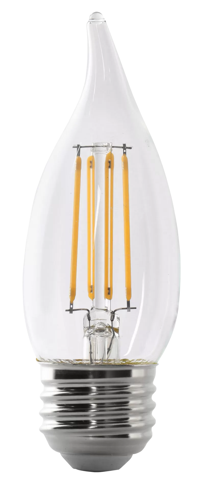 60W eq / 5.5W act, 120V, 500 Lumens, Color: 2700K (Soft White), Lamp Base: E26, Lamp shape: Flame Tip, Lamp Finish: Clear, Lamp Material: Glass, Average Life: 15000 hr