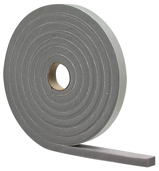 Foam Tape, 3/8 in W, 17 ft L, 3/16 in Thick, PVC, Gray. Polyvinyl chloride foam. A self-sticking weatherproofing foam tape for eliminating air and moisture leaks.