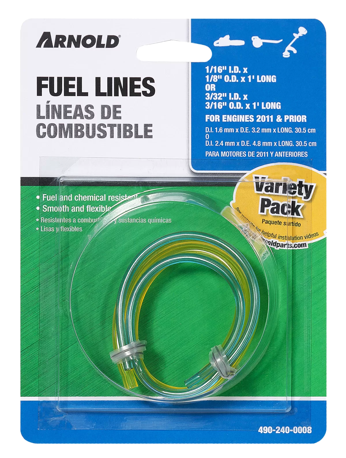 Arnold 490-240-0008/GL23 Gas Fuel Line, Clear Yellow, For: 2011 and Prior Small Engines. Contains one 1/16 in ID x 1/8 in OD x 1 ft and one 3/32 in ID x 3/16 in OD x 1 ft L. Fuel and chemical resistant. Smooth and flexible.