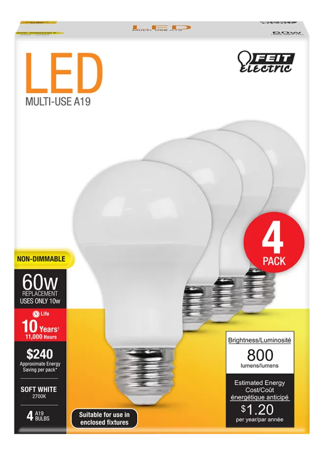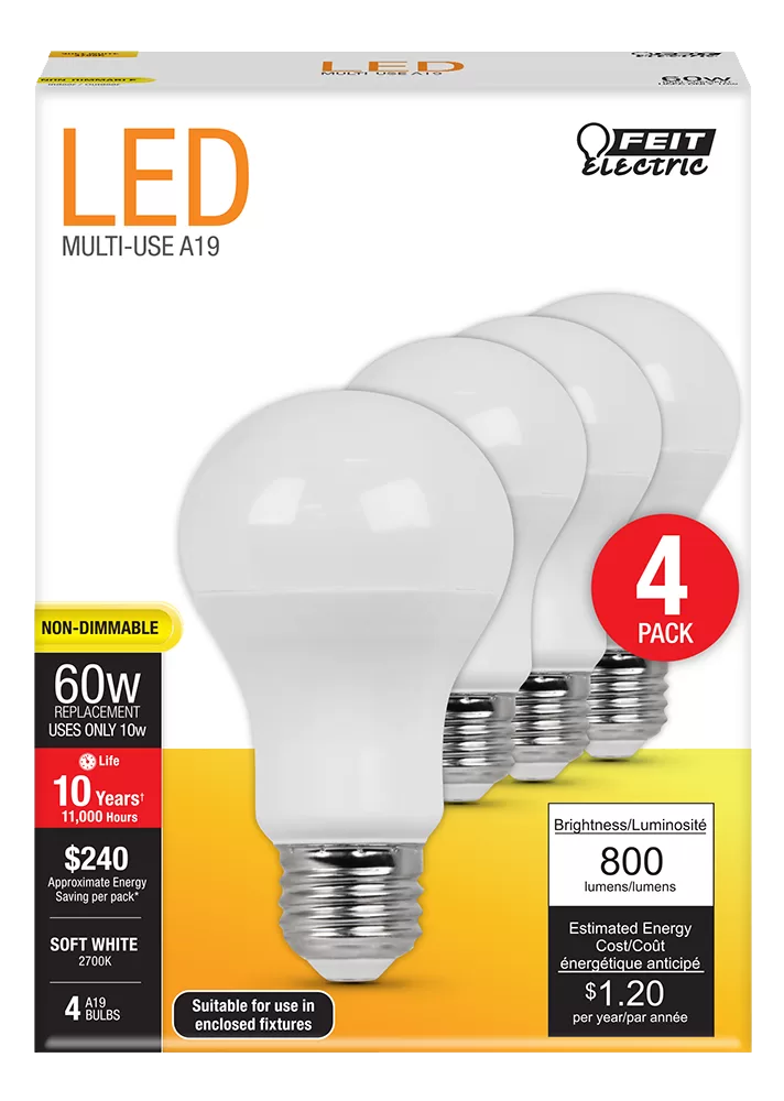 60W eq / 10W act, 120V, 800 Lumens, Color: 2700K (Soft White), Lamp Base: E26, Lamp shape: A19, Lamp Finish: White, Lamp Material: Platic, Average Life: 11000 hr