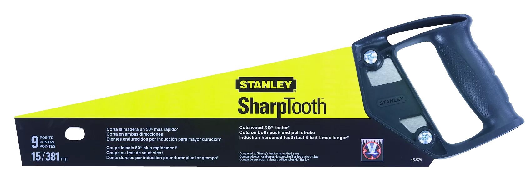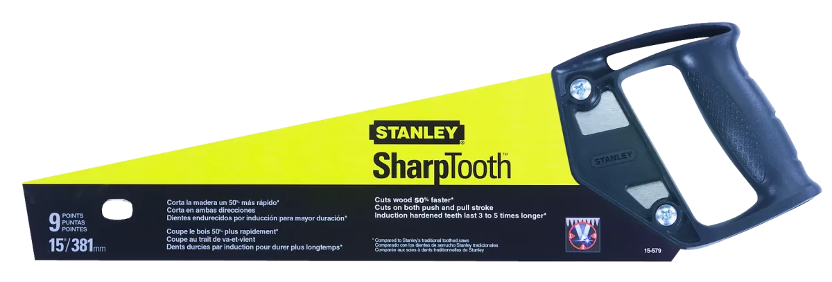 The Stanley 15 in TRADECUT panel saw provides quick, efficient cutting with triple ground induction hardened teeth and a comfortable, slip-resistant bi-material grip.