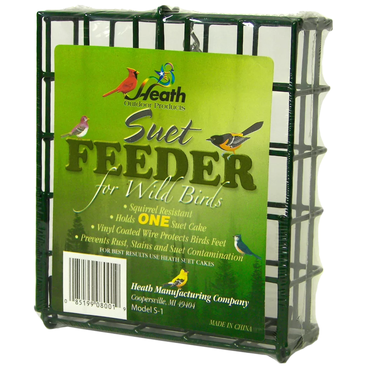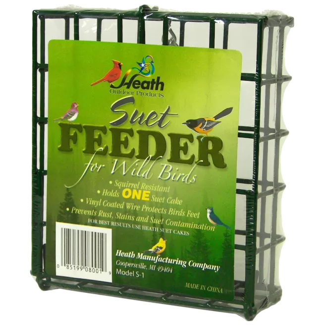 The Heath Outdoor Products suet feeder makes offering suet easy. The vinyl-coated metal cage is safe for birds, weather-resistant, rust-resistant and designed for use with standard-sized suet and small seed cakes.