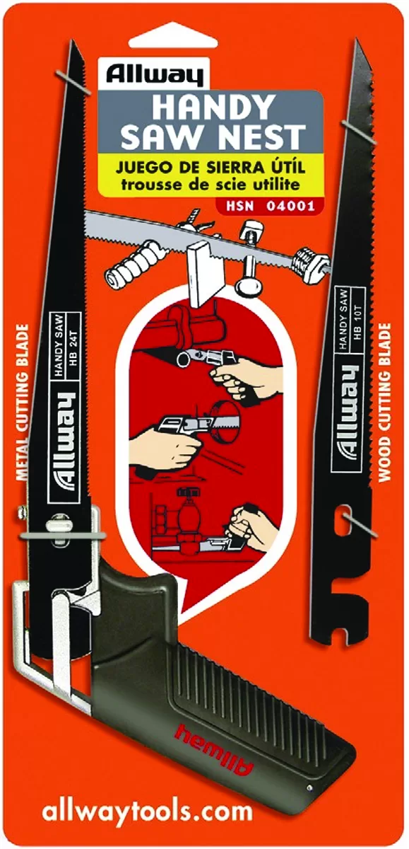 Pistol grip, keyhole saw with two 7-1/2 in blades (1-24TPI and 1-10TPI) for metal and wood cutting. Saw handle has comfortable, soft grip.