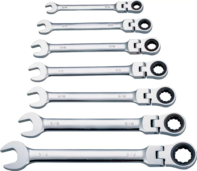 The flexible wrench set includes 8 mm, 10 mm, 12 mm, 13 mm, 14 mm, 15 mm and 17 mm sized wrenches. Its flex head tilts up to 180 deg, allowing access to the narrowest of working areas.