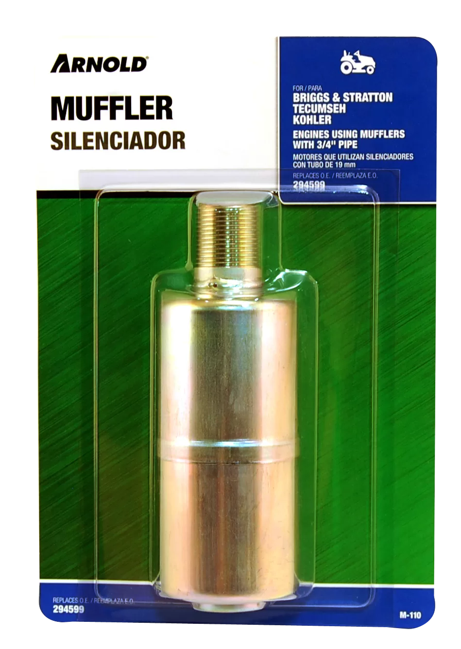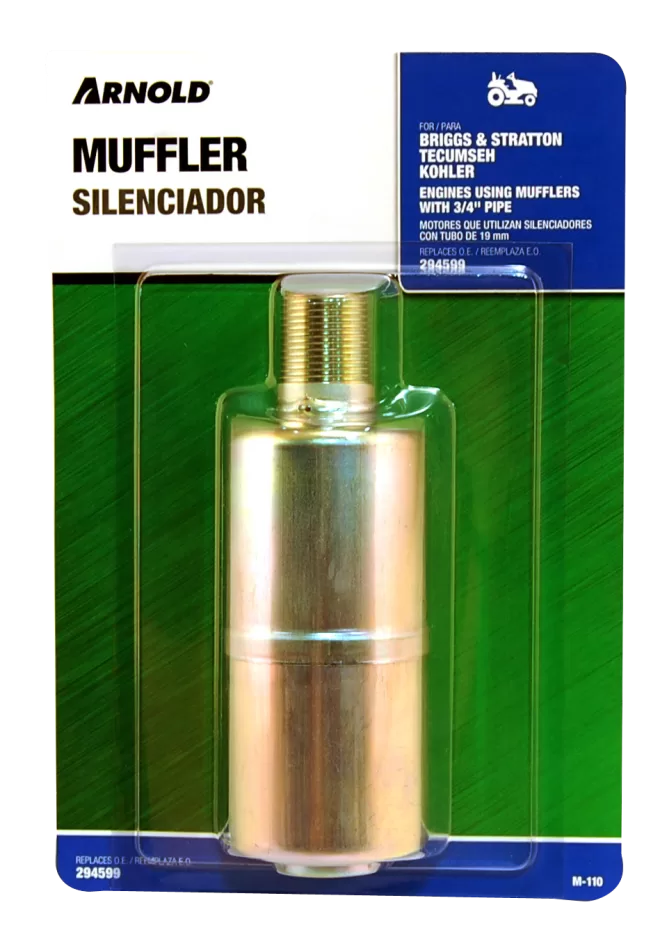 Arnold M-110 Small Engine Muffler, 3/4 in Inlet. Fits most 5, 7 and 8 hp Briggs & Stratton, Tecumseh, Kohler and Clinton engines. Replaces Briggs & Stratton No. 294599 and others.