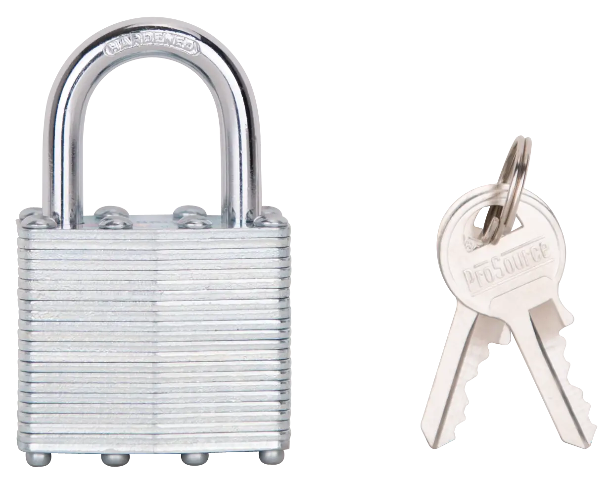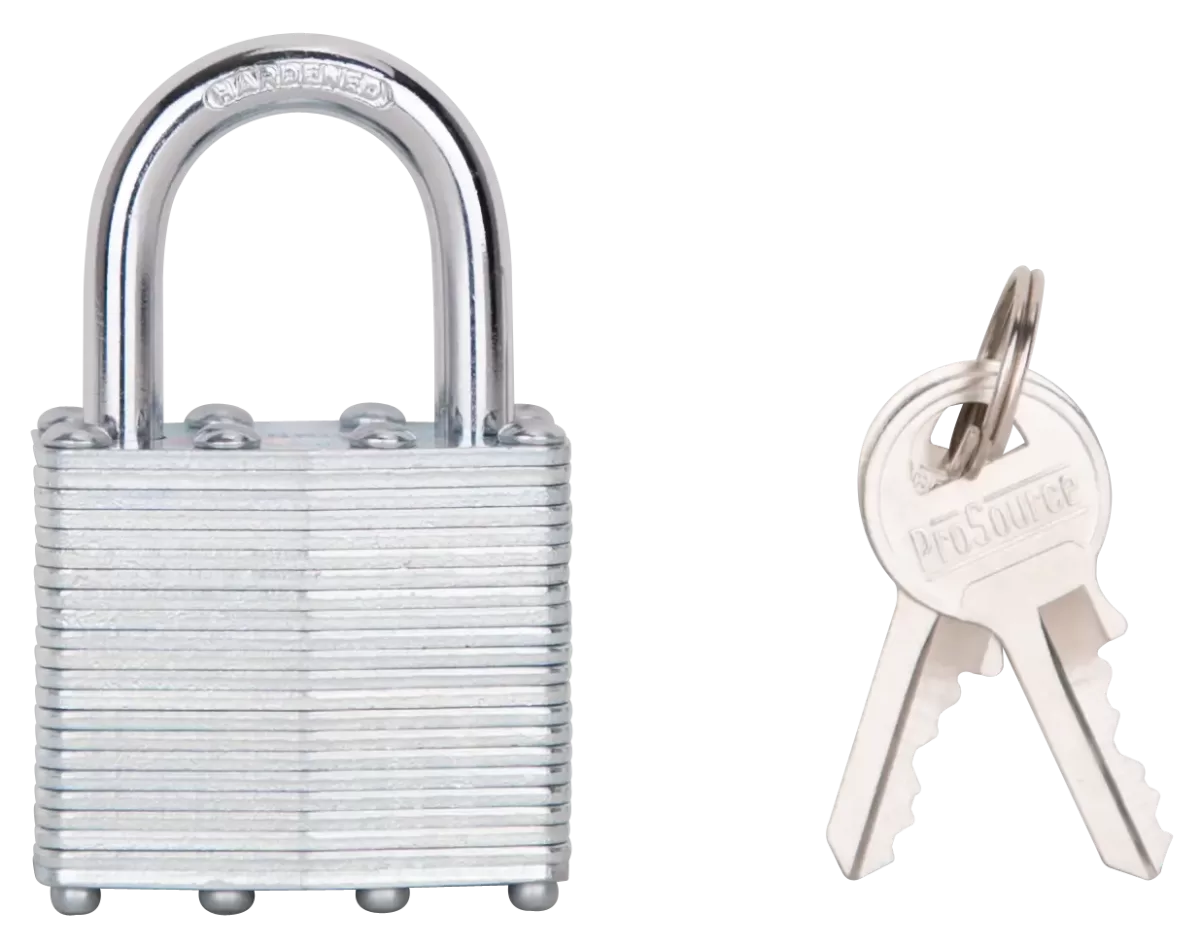 The ProSource padlock is ideal for high security. It has a steel tumbler with a hardened steel shackle and two brass keys are included.