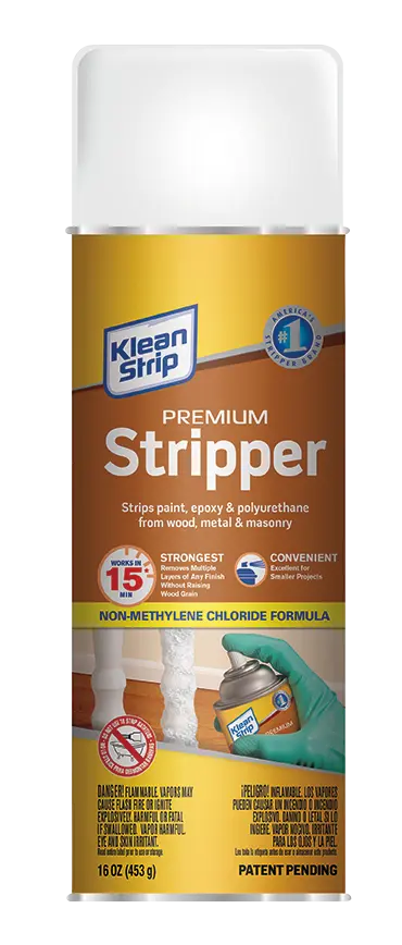 Klean Strip® premium stripper aerosol non-methylene chloride is a patent pending aerosol formula that takes 15 min to dissolve multiple layers. It quickly removes latex and oil-based paint and polyurethane from wood, metal and masonry surfaces.