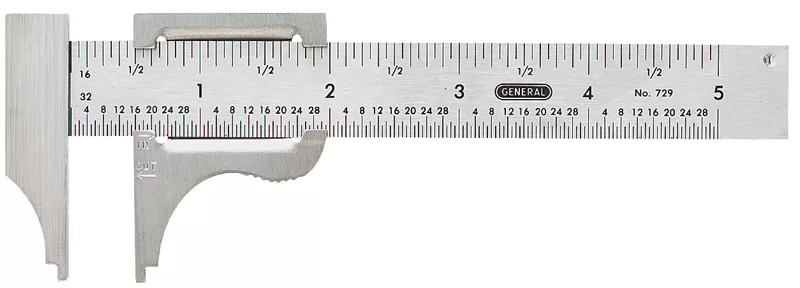 This slide caliper provides inside and outside readings in both etched and filled 16ths and 32nds graduations. A decimal equivalents chart on the caliper’s back side is helpful in making measurement calculations.