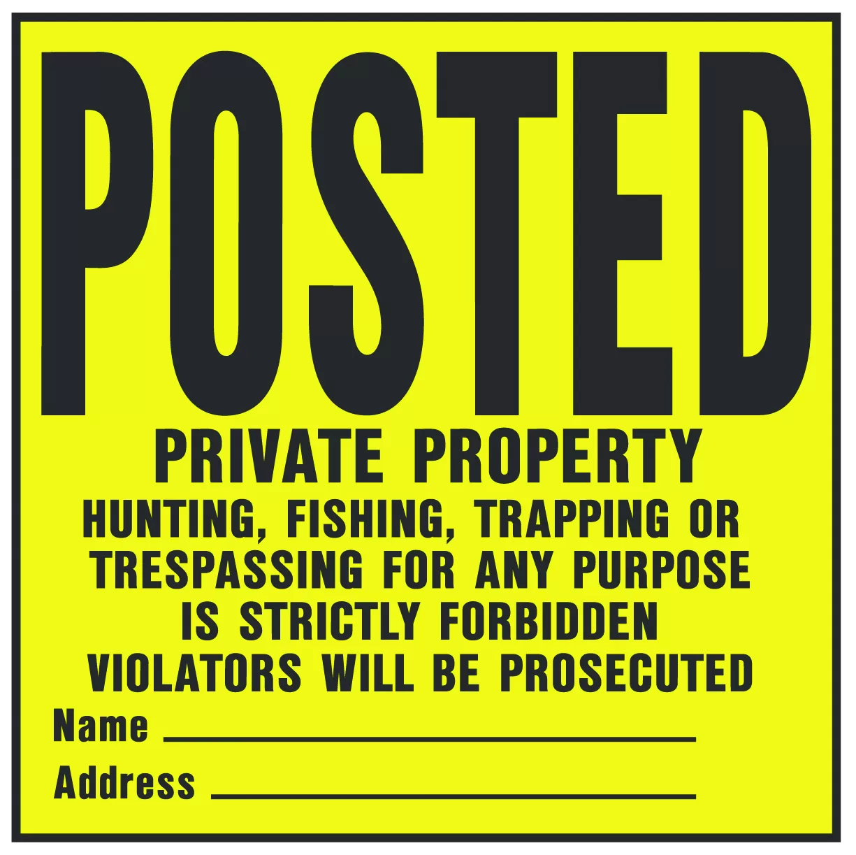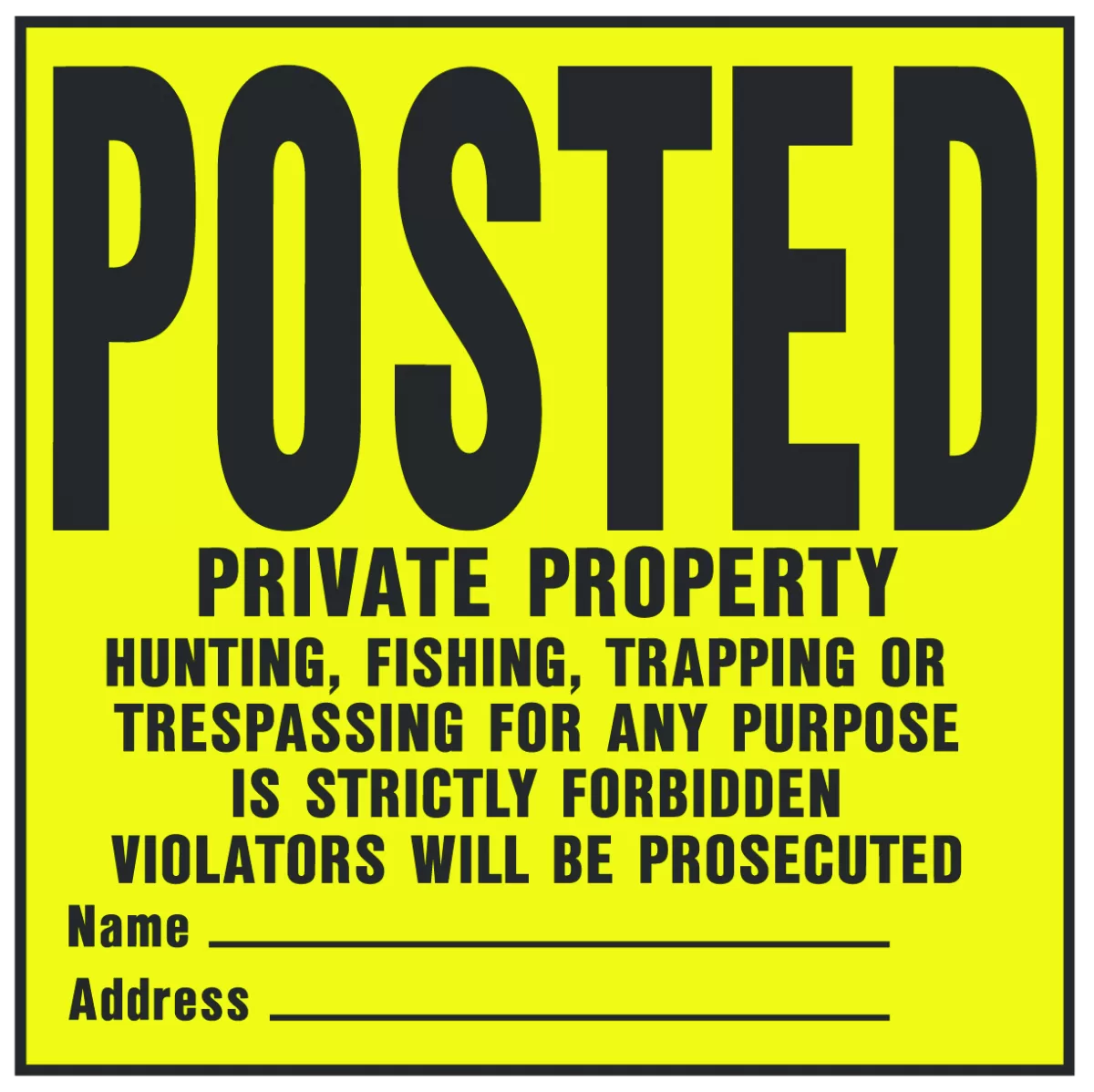 Made of durable weatherproof plastic. Yellow background with black lettering. States “POSTED…PRIVATE PROPERTY…HUNTING, FISHING, TRAPPING, OR…TRESPASSING FOR ANY PURPOSE…IS STRICTLY FORBIDDEN…VIOLATORS WILL BE PROSECUTED” 11″ X 11″