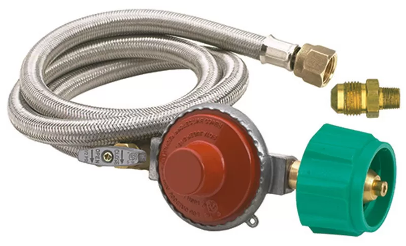 10 psi high pressure regulator, brass control valve, 48 in stainless braided LPG hose with 3/8 flare swivel fitting and includes a No. 57 orifice brass connector (3/8 in male flare inlet x 1/8 in MNPT outlet). Do not use on gas grills.