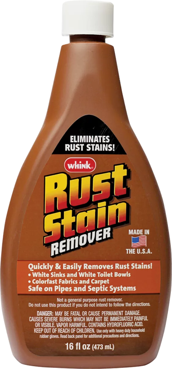 This convenient liquid formula quickly and easily removes rust stains from white sinks and white toilets, as well as colorfast fabric and carpets.