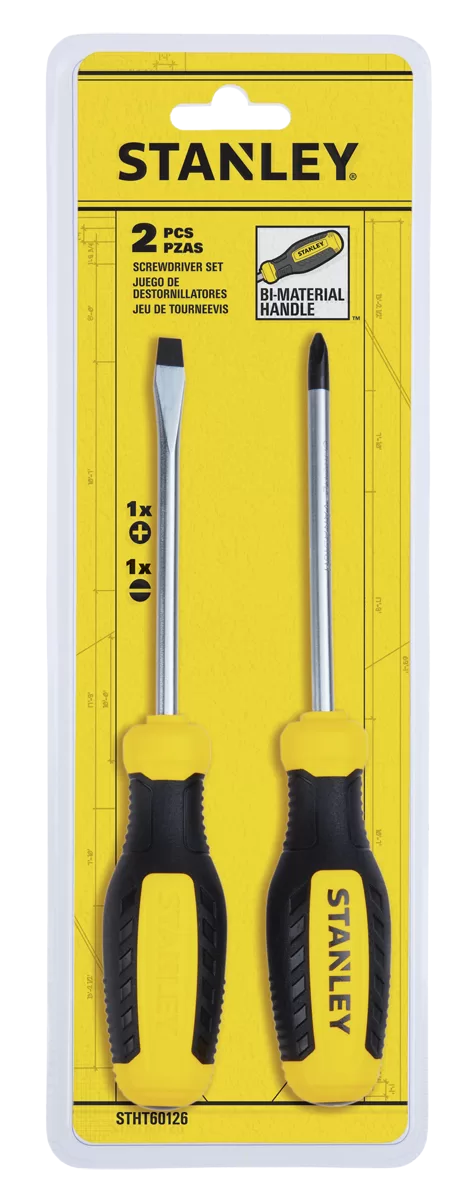 The Stanley 2 pc screwdriver set features popular tip sizes and includes a #2 Phillips screwdriver and a 1/4 in flat head screwdriver to fulfill a wide range of fastening needs.