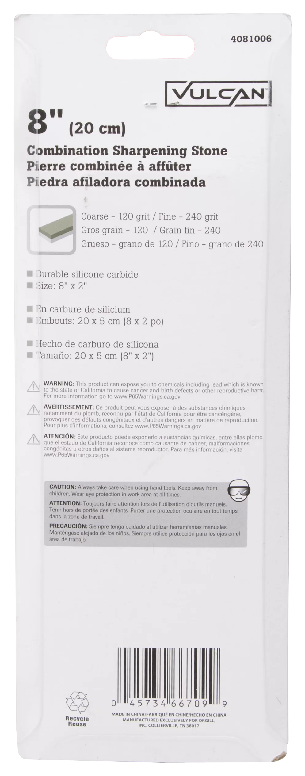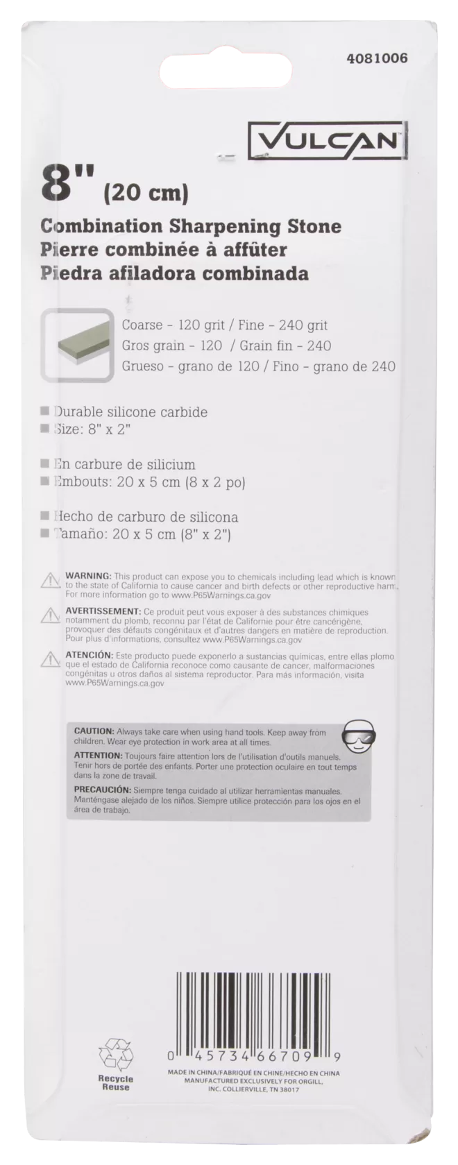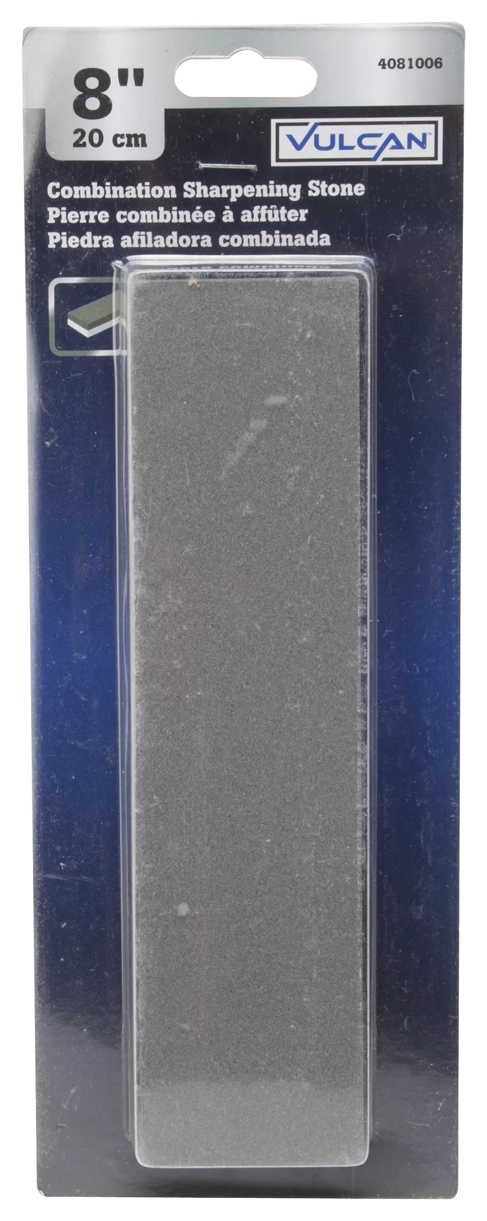 The Vulcan sharpening stone grit grade is coarse (240) and fine (120). It’s silicon carbide abrasive. The length is 8 in.