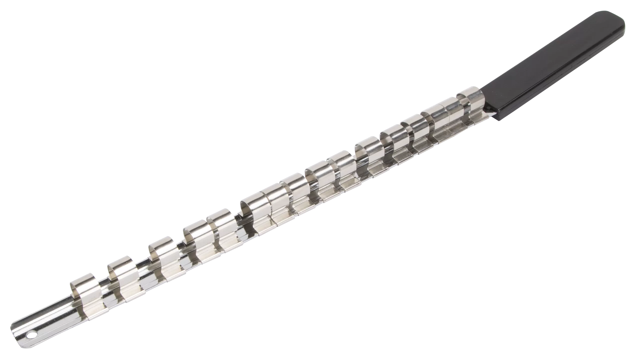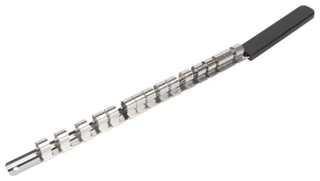 The Vulcan socket clip rail is made from chrome-plated steel. The clip rail is for 1/2 in sockets and holds up to 16 sockets for easy storage.