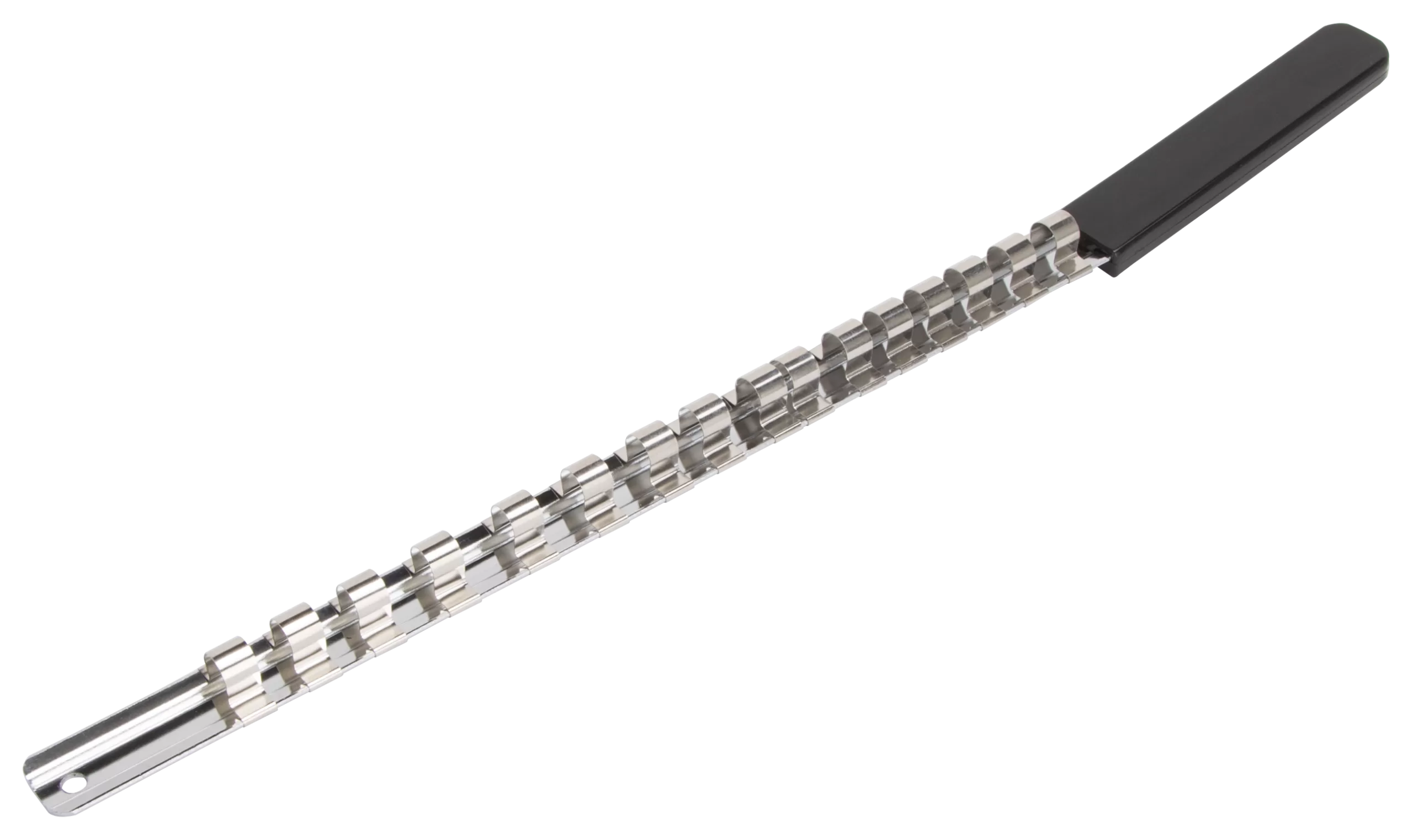 The Vulcan socket clip rail is made from chrome-plated steel. The clip rail is for 3/8 in sockets and holds up to 16 sockets for easy storage.