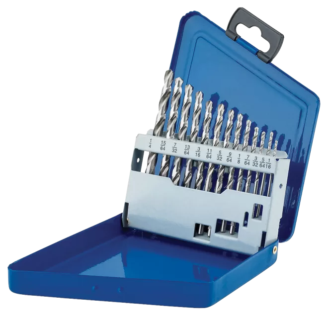 Bits are constructed of M-2 high-speed steel for strength, heat and wear resistance. Standard 118 deg point for use in wood, metal and plastic. Includes 1/16 in through 1/4 in in 1/64 in increments in a metal index case.